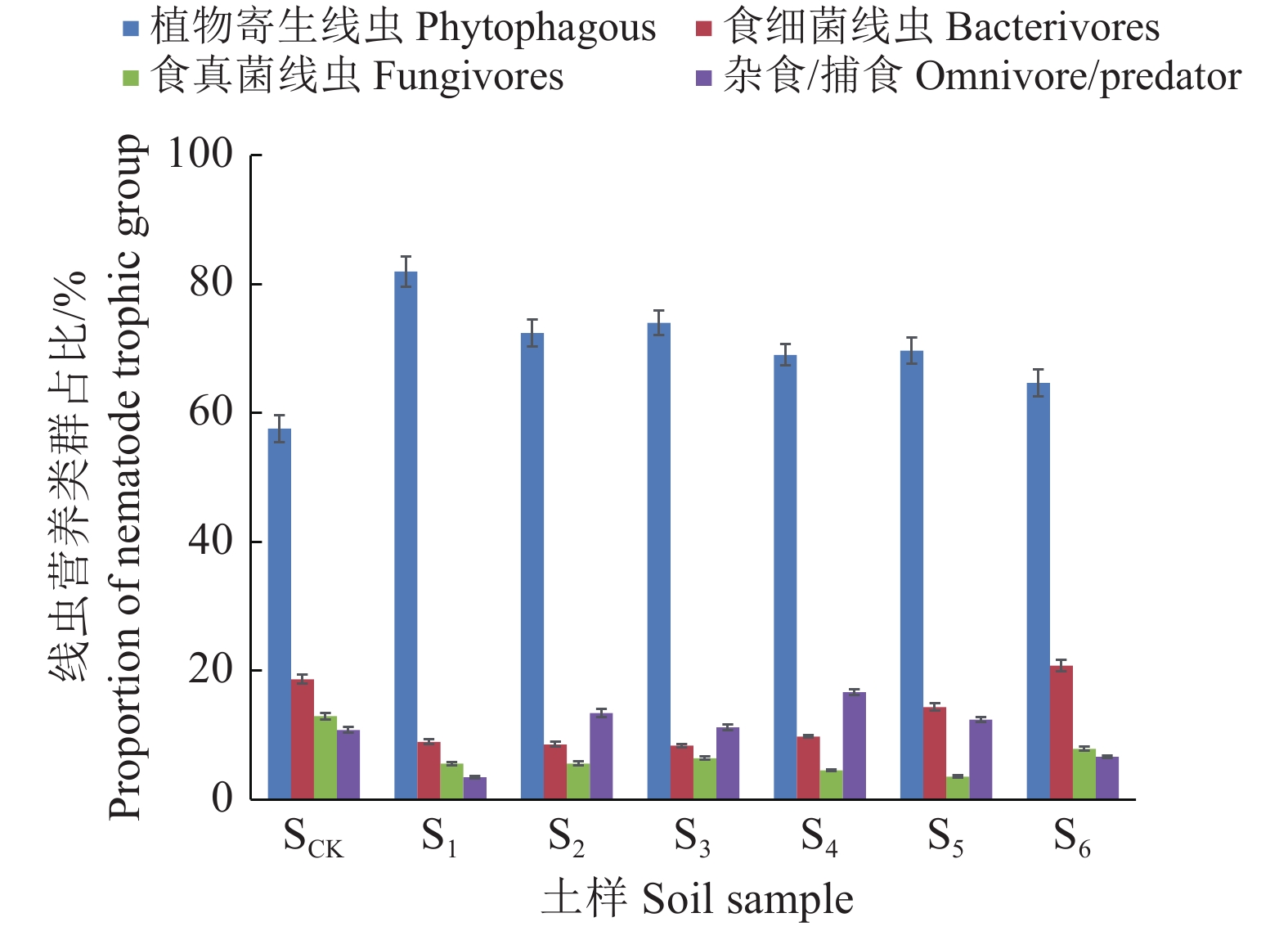 2.2 土壤线虫群落结构对淮北矿区土壤环境的响应 2.2.1 矿区土壤环境对土壤线虫营养类群的影响对不同矿区土壤的线虫群落结构进行分析,共鉴定出19个属(表3),SCK、S1、S2、S3、S4、S5、S6分别鉴定出18、15、16、15、16、16、16个属。矿区土壤样品S1、S2、S3、S4、S5、S6鉴定出的线虫属数均低于SCK,表明采煤矿区的土壤环境能够降低土壤线虫属的数目。图6显示,不同矿区土壤样地的线虫优势类群均为植物寄生线虫。土壤线虫个体数目占线虫群落个体总数10%以上的为优势线虫属,SCK的优势属为短体属,矿区土壤样品S1的优势属为螺旋属,S2的优势属为螺旋属、矮化属、短体属和丝尾垫刃属,S3的优势属为螺旋属、矮化属和垫刃属,S4的优势属为螺旋属、矮化属和短体属,S5的优势属为螺旋属、矮化属和短体属,S6的优势属为螺旋属和矮化属。