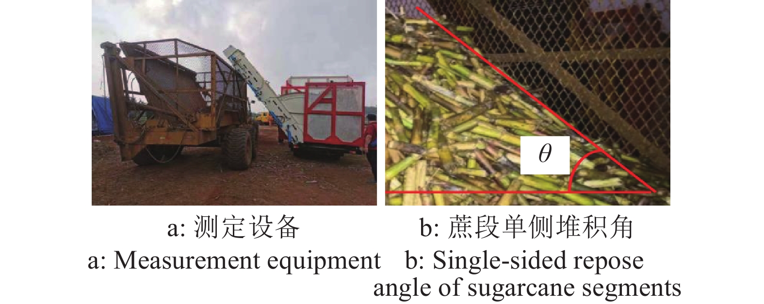 1.2 蔗段物理堆积角测定堆积角是表征散装物料流动、摩擦等性质的宏观参数,与物料种类、长径比、形状和含水率等因素有关,因此堆积角试验常被用作散装物料的离散元标定[10]。蔗段物理堆积角的测量方法为:采用华南农业大学自主研制的甘蔗田间运输车,将蔗段从田间运输车的输送臂卸到公路运输车内,蔗段从相对高度1500 mm处落下,待所有蔗段静止后,在公路运输车内形成稳定的甘蔗堆,用角度测量仪测量蔗段堆积角,试验重复10次,获得蔗段物理试验堆积角为39.40°~45.80°,平均值为42.70°,标准差为2.6。蔗段物理堆积试验,如图1所示。