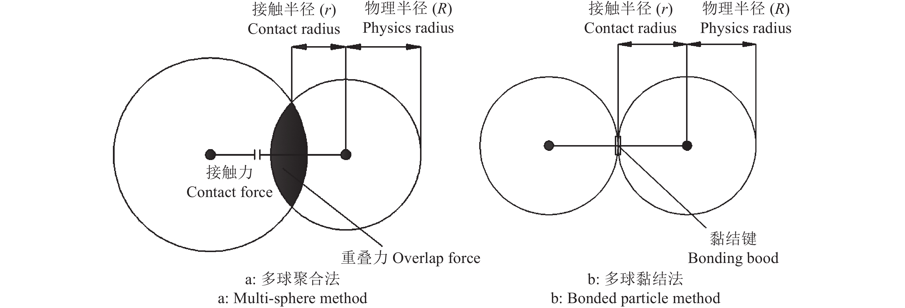 非球形颗粒建模通常采用多球聚合模型(Multi-sphere method,MSM)[22-24]和多球黏结模型(Bonded particle method,BPM)[25-26]。多球聚合模型(图2a)由多个颗粒堆叠聚合而成,该离散元模型与实际物料轮廓相对吻合,且在EDEM软件中被视为一个独立体。多球黏结模型(图2b)由多个直径相同的颗粒通过“黏结键”粘连而成,颗粒间相互独立,半径越小,越接近实际物料轮廓,但是会增加仿真时间,适用于DEM-CFD耦合仿真[13,27]。