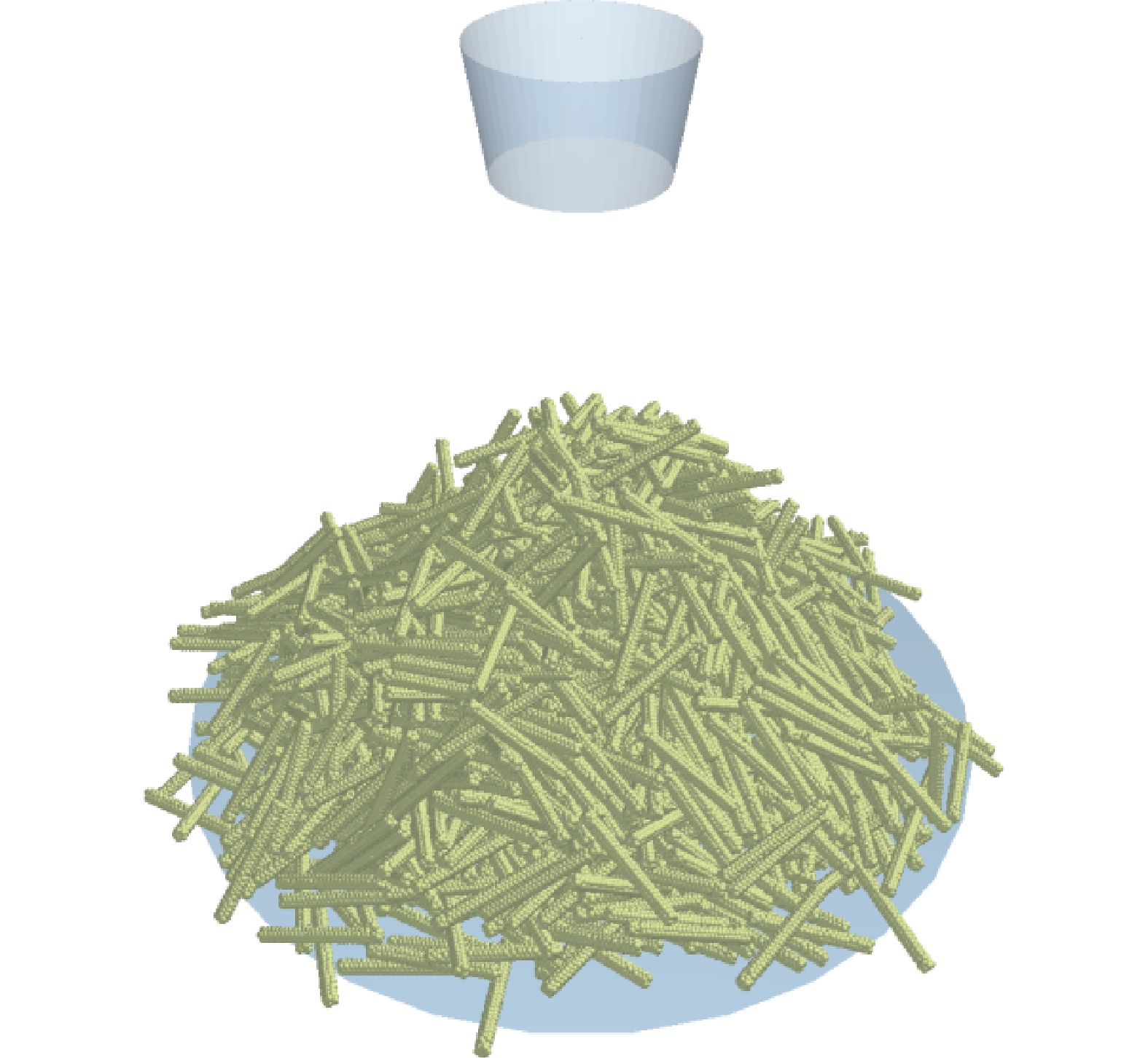 在EDEM中建立漏斗(上、下开口直径分别为500 mm和400 mm、高度300 mm、下端面离地高度为1500 mm)和接料板(直径1500 mm),设置颗粒工厂在漏斗上方口径处,总生成量为1400根,生成速率为100根/s,仿真时间为16 s,仿真蔗段的堆积过程,如图4所示。