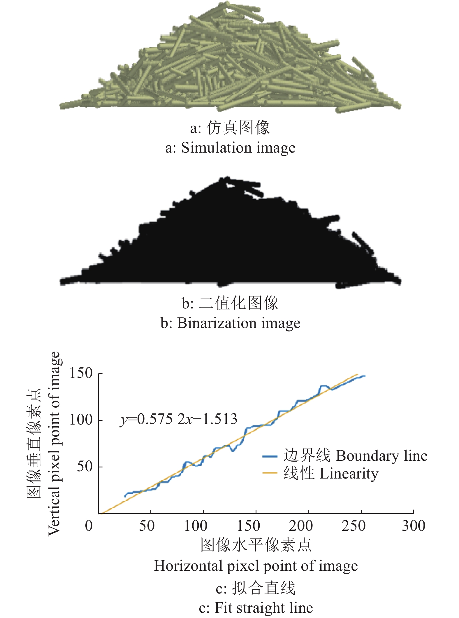仿真试验中,为了更准确地测量仿真堆积角,采用计算机图像处理技术对其进行处理。首先在EDEM中截取仿真蔗段堆的正视图,如图5a所示,再利用Matlab软件对获得的图像进行灰度化、二值化(图5b)、边界像素点的搜索与提取,最后通过线性拟合获取拟合方程,得到方程斜率K[31]。蔗段堆积角(θ)计算公式[32]为: