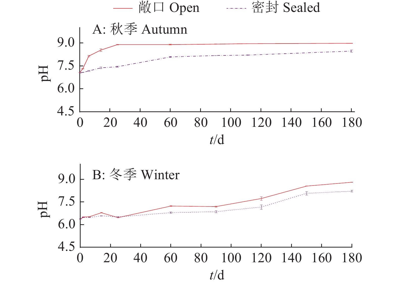 2 结果与分析 2.1 不同贮存方式对猪粪水理化特性的影响 2.1.1 猪粪水贮存过程中pH的变化试验过程中猪粪水pH的测定结果见图1。各处理猪粪水pH均在试验启动后逐渐增加,但秋季的增加速度明显快于冬季,秋季的猪粪水pH在60 d时已基本稳定,而冬季的猪粪水pH在试验结束时仍缓慢增加,表明贮存温度对猪粪水有机物分解速度影响较大,表现为pH增加速度上的差异。贮存方式对猪粪水pH有较大影响,在秋季,敞口贮存的猪粪水pH始终高于密封贮存的,且在试验启动后迅速增加,在试验25 d时已达到基本稳定,而密封处理在60 d时才达到基本稳定;在冬季,试验的前25 d敞口和密封贮存的猪粪水pH非常接近,二者间无明显差异,但25 d后差距逐渐拉大,到试验结束时,敞口和密封贮存猪粪水pH分别为8.81和8.22,表明密封贮存可以降低猪粪水pH,这可能与密封条件下产生的二氧化碳大量溶于猪粪水有关,而这对减少氨挥发是有利的。根据《农田灌溉水质标准(GB 5084—2021)》[21]的要求,农田灌溉水pH为5.5~8.5,而猪粪水敞口贮存后高于该标准,但密封贮存后pH在标准范围内。