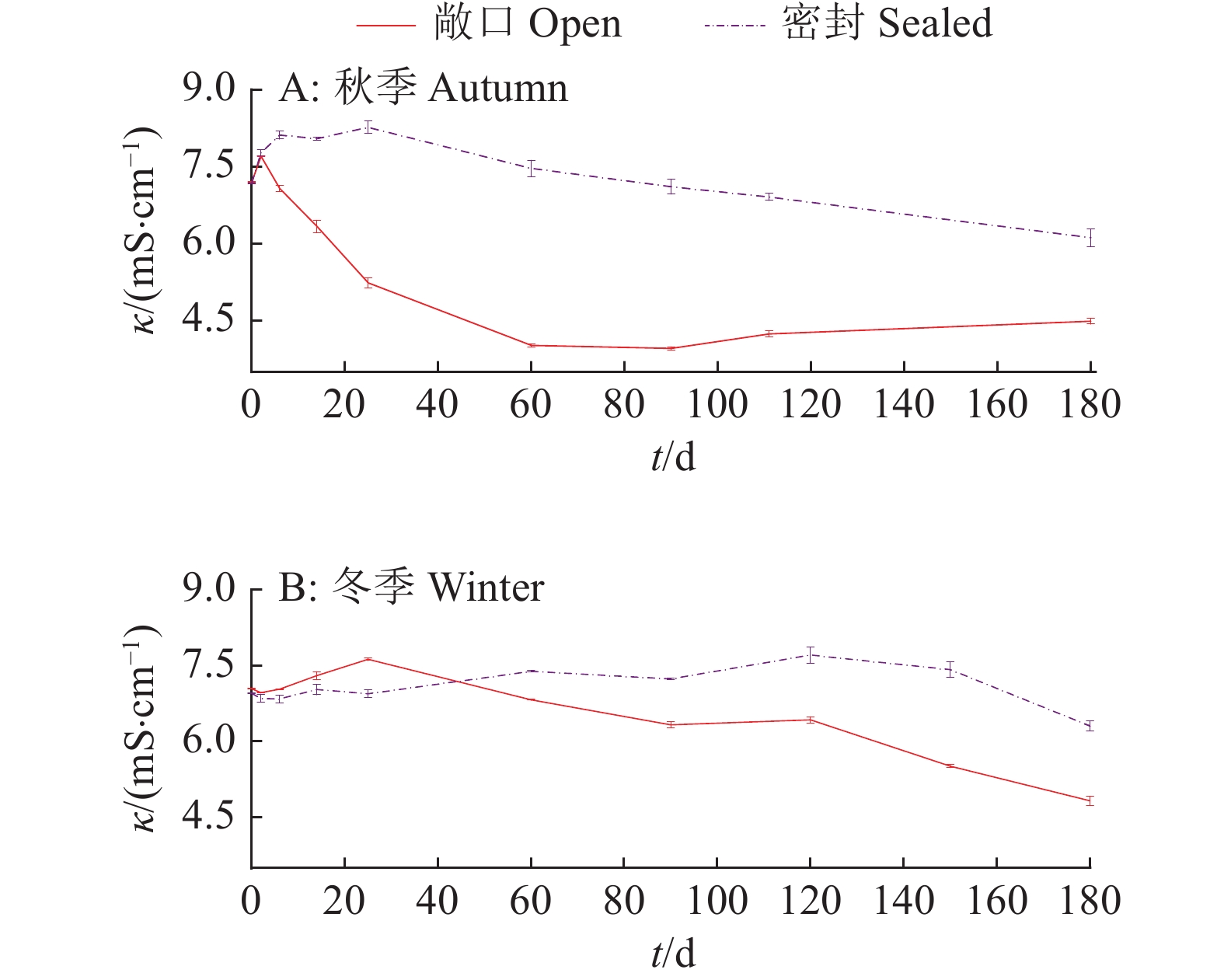 1.2 试验方法分别于2020年9月和12月进行秋季和冬季试验,反映不同贮存温度对猪粪水贮存过程的影响。试验设置敞口贮存和密封贮存2种方式,除瓶口是否密封外,其他操作相同。试验在总容积1 L的玻璃容器内进行,加入猪粪水800 mL,敞口处理用纱布覆盖瓶口,并用橡皮筋固定,避免杂物掉入;密封处理在瓶口用橡胶塞塞紧,在橡胶塞中间位置打孔穿入玻璃管,玻璃管另一侧通过硅胶管接入集气瓶,于室外常温下(避雨但不避光)进行试验。每个处理3个平行,取平均值进行分析。秋季试验分别于试验第0、2、6、14、25、60、90、111和180天取样,冬季试验分别于试验第0、2、6、14、25、60、90、120、150和180天取样,记录每次取样量。取样后立刻测定猪粪水pH和κ,TN、NH4+-N、NO3−-N和COD在取样24 h内测完,种子发芽率和重金属含量在试验最后一次取样后集中测定。