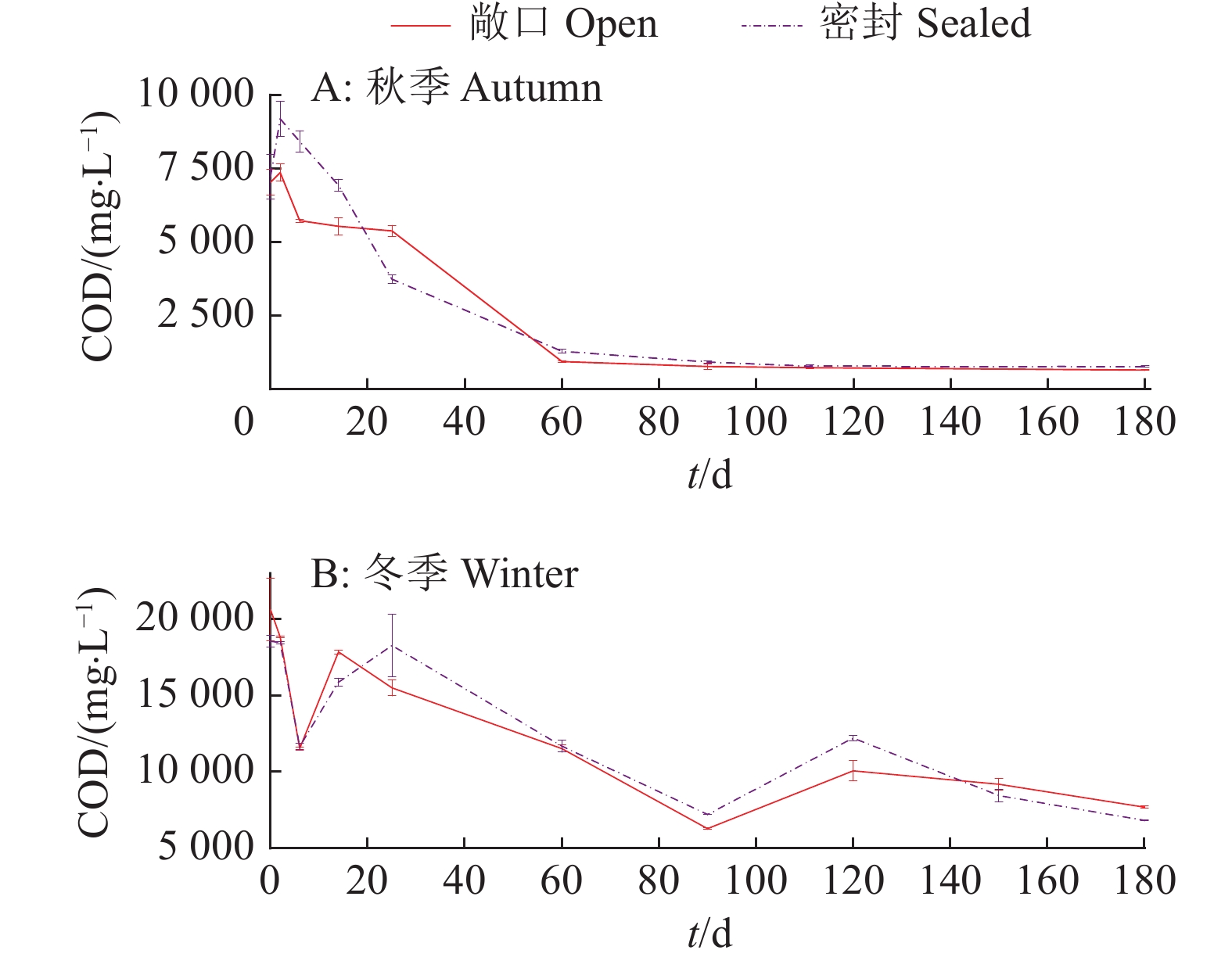 猪粪水贮存过程中,有机物被微生物分解,其变化可间接反映猪粪水是否达到稳定化。试验过程中各处理的COD变化见图3。由图3可以看出,在试验过程中各处理猪粪水COD总体均为逐渐下降趋势;试验结束时,秋季敞口和密封贮存的猪粪水COD分别为645和765 mg/L,冬季敞口和密封贮存的猪粪水COD分别为7 683和6 816 mg/L,敞口与密封贮存对猪粪水COD无显著差异(P > 0.05),表明贮存方式对贮存过程中猪粪水有机物去除并无显著影响。但不同季节猪粪水COD存在较大差异,冬季的猪粪水COD明显高于秋季,这与冬季猪舍用水量较少有关,贮存后冬季猪粪水COD亦远高于秋季,这对贮存后的猪粪水还田有一定影响,即贮存后猪粪水还田时的稀释倍数不同。
