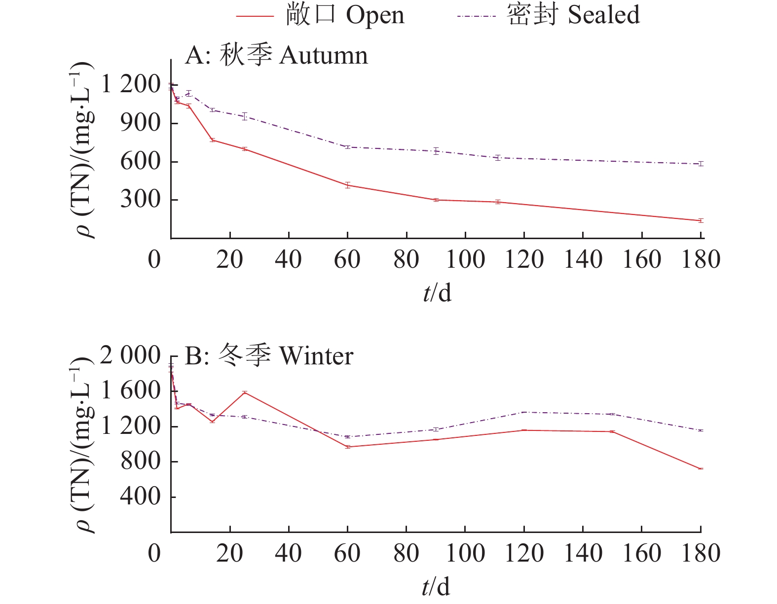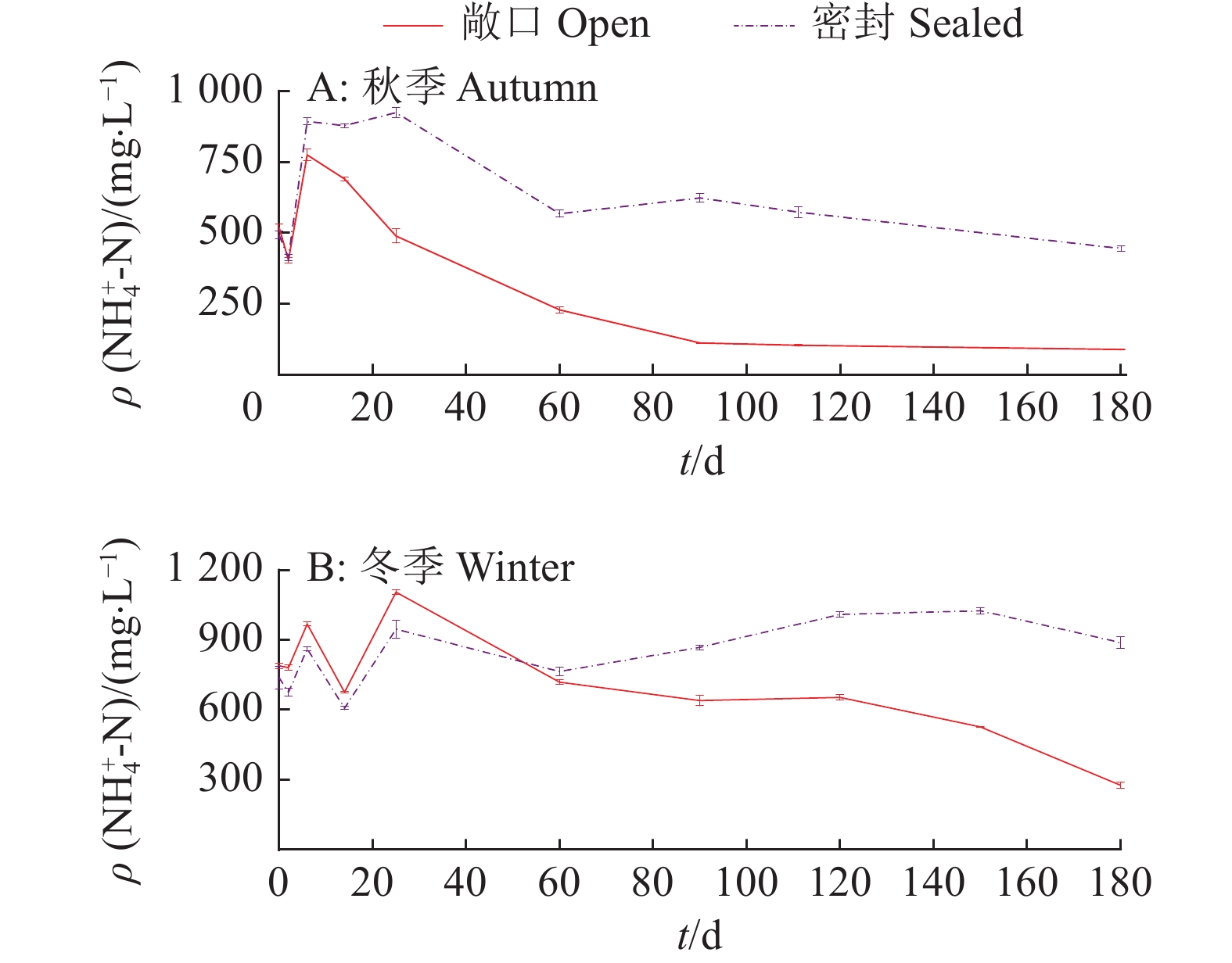 试验过程中猪粪水总氮含量的测定结果见图6。由图6可以看出,各处理总氮含量的变化趋势相似,总体上均为逐渐降低的趋势,但降低速度和幅度存在差别,且试验结束时均为密封贮存的猪粪水总氮含量高于敞口贮存的。秋季试验启动后,密封贮存的总氮含量始终高于敞口贮存,敞口和密封贮存总氮质量浓度分别从试验开始时的1 189.72和1 194.62 mg/L降低为试验第180 天的139.52和585.15 mg/L,降幅分别达88.27%和51.02%;冬季贮存试验启动后的前60 d,敞口和密封贮存的总氮含量间并无显著差异(P > 0.05),但试验60 d后密封贮存的总氮含量始终高于敞口贮存,敞口和密封贮存总氮质量浓度分别从试验开始时的1 848.03和1 904.03 mg/L降低为试验第180天的722.62和1 160.14 mg/L,降幅分别达60.90%和39.07%。由此可以看出,经180 d贮存后,猪粪水总氮含量均大幅降低,密封贮存显著减少了氮素损失,冬季贮存较秋季贮存减少了氮素损失,这可能与贮存温度有关,建议采用地下池密封贮存的方式,以减少猪粪水贮存中的氮素损失。