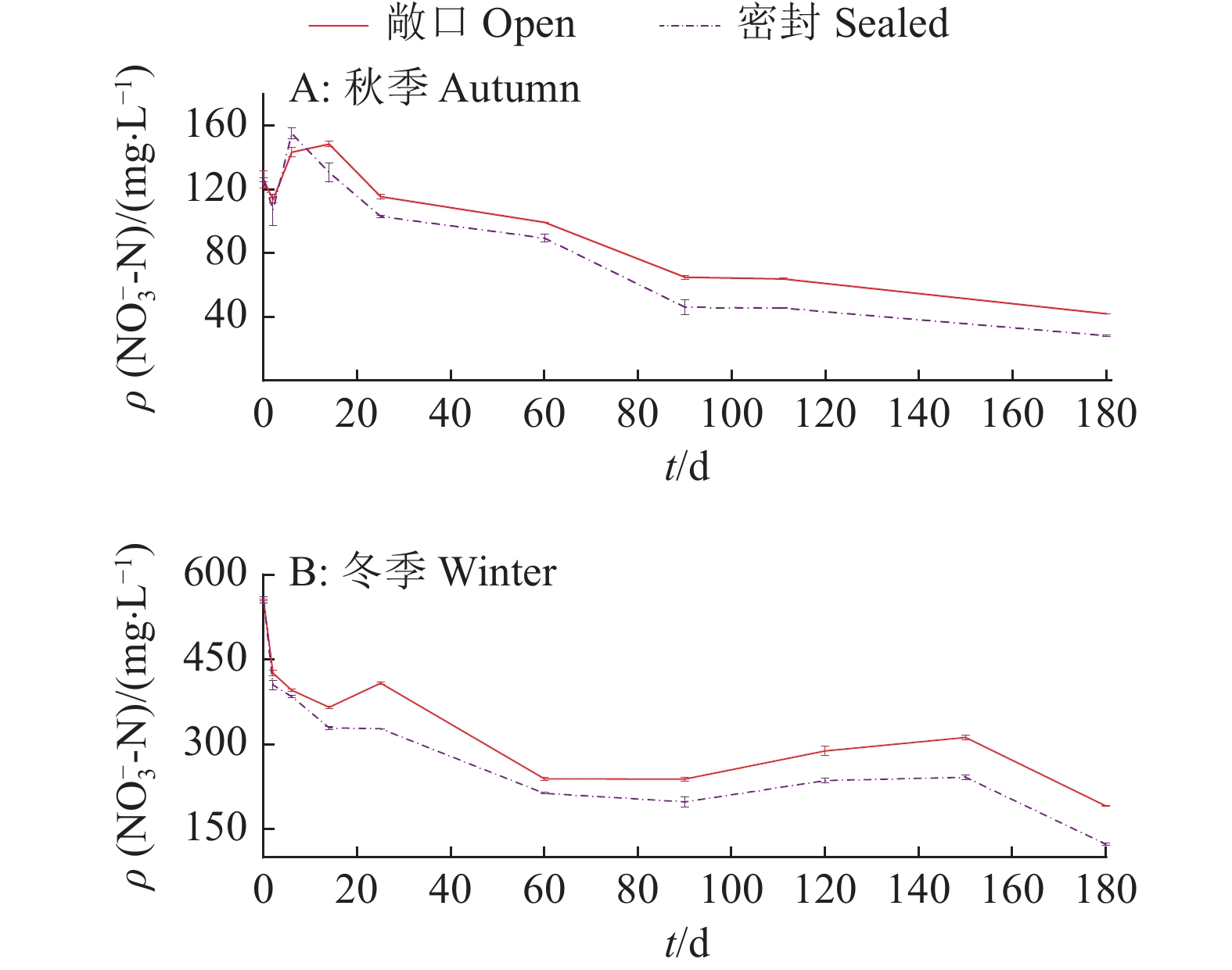 试验过程中NO3−-N含量的变化见图5。由图5可以看出,各处理NO3−-N含量变化趋势相似,总体均为逐渐下降趋势,且敞口贮存的NO3−-N含量高于密封贮存的。试验结束时,秋季敞口和密封贮存的NO3−-N含量分别为41.90、28.13 mg/L,冬季敞口和密封贮存的NO3−-N含量分别为190.62、122.81 mg/L,敞口贮存显著高于密封贮存(P < 0.05),这可能是敞口条件下部分NH 4+-N在氧气存在下经硝化作用转化为NO3−-N,减少了NO3−-N的降低幅度,但这方面的效果有限。