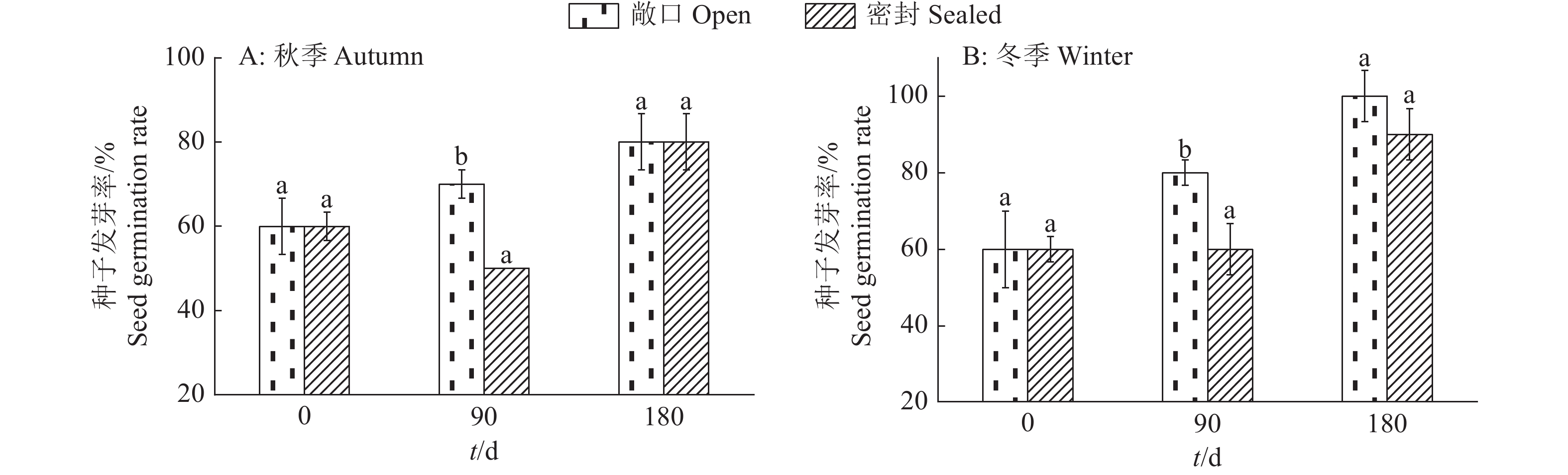 种子发芽率可作为评价猪粪水生物毒性的重要指标。试验过程中各处理种子发芽率见图7。由图7可以看出,试验过程中猪粪水各处理的种子发芽率总体为随贮存时间增加而逐渐增加的趋势,但贮存方式及贮存温度对种子发芽率有一定影响。在秋季,敞口贮存的种子发芽率随贮存时间稳步增加,从试验开始时的60%增加至180 d时的80%,而密封处理在90 d时种子发芽率下降至50%,到试验结束时增加至80%;在冬季,敞口猪粪水的种子发芽率稳步增加,从试验开始时的60%增加至180 d时的100%,而密封处理在90 d时种子发芽率仅为60%,试验结束时增加至90%,说明密封贮存过程中有机物厌氧分解可能产生一些对种子发芽有抑制作用的物质,但随着贮存时间延长这些物质被进一步分解,而敞口贮存不存在该问题。贮存后种子发芽率冬季优于秋季,这可能与冬季贮存后期气温升高促进了猪粪水中抑制性物质的分解有关。