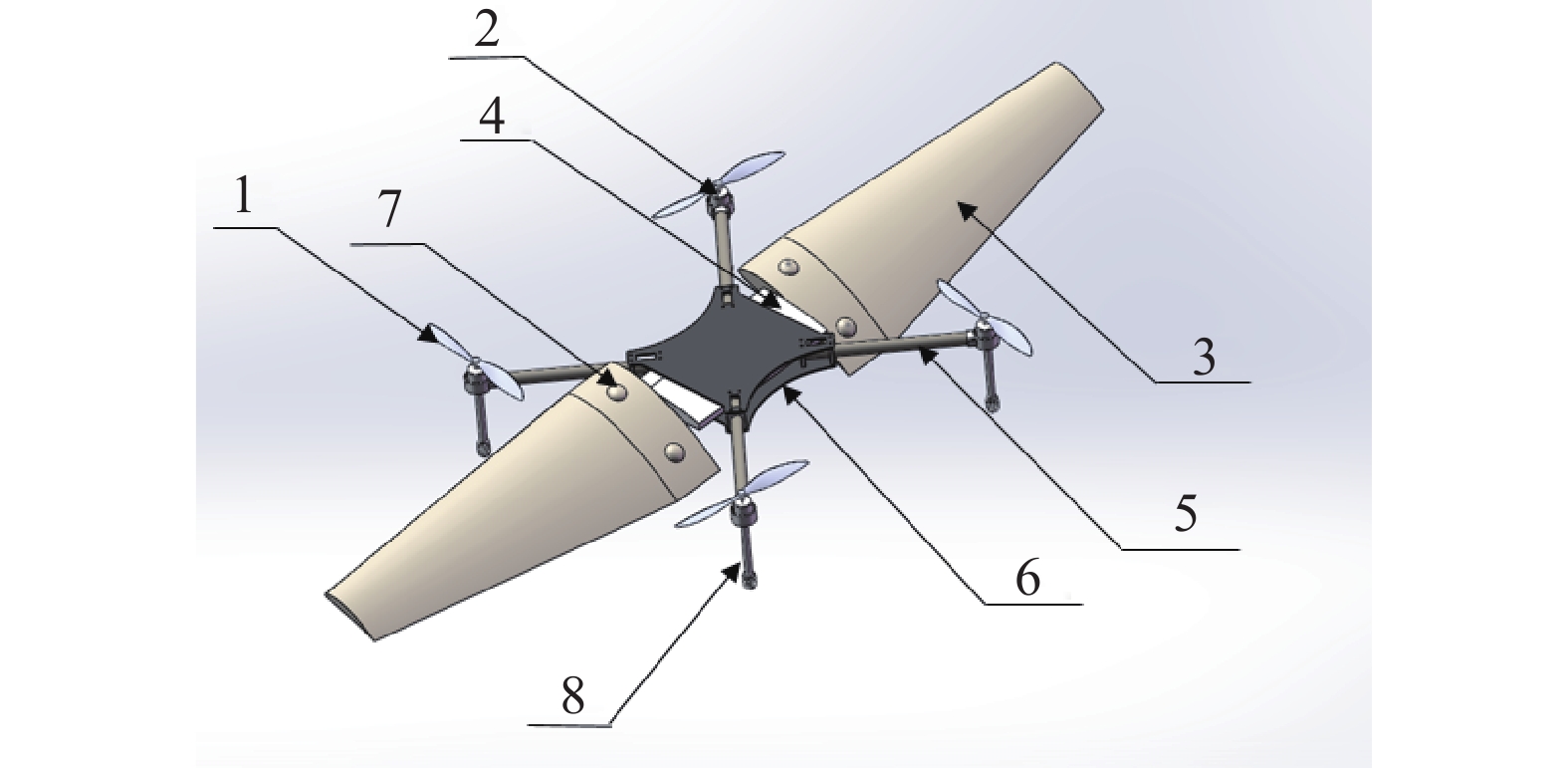 图 1 植保无人机的结构构型示意图 Fig. 1 Structural configuration diagram of plant protection UAV 1:螺旋桨;2:电机;3:机翼;4:倾转机构;5:支撑臂;6:中心架;7:可拆卸卡扣;8:起落架 1: Propeller; 2: Motor; 3: Wing; 4: Tilting mechanism; 5: Support; 6: Center; 7: Removable buckle; 8: Landing gear |
