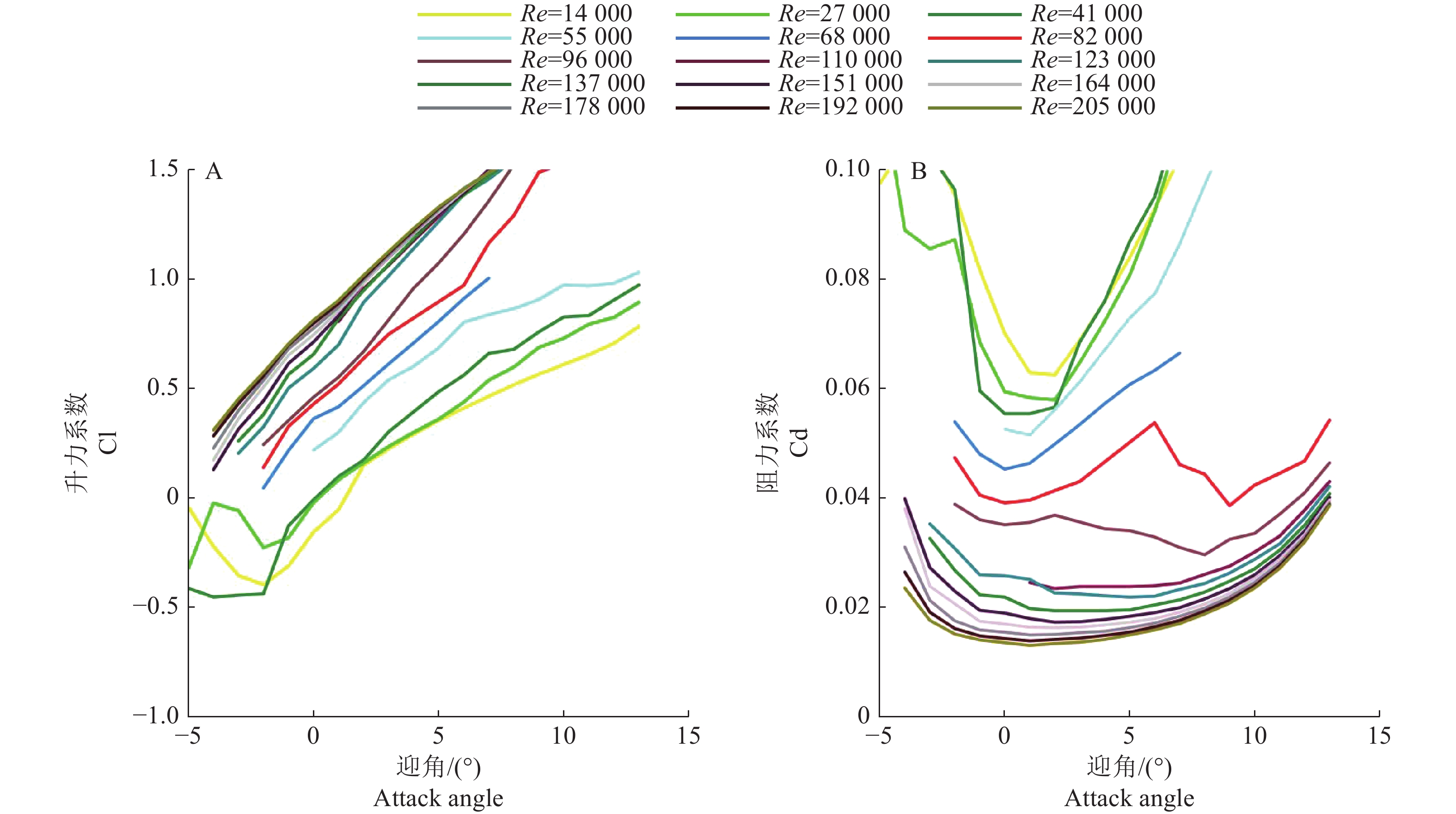 图 4 不同雷诺数下的升力系数(Cl)和阻力系数(Cd)与迎角关系 Fig. 4 Relationship between the lift coefficient (Cl),drag coefficient (Cd) and the attack angle under different Reynolds number |