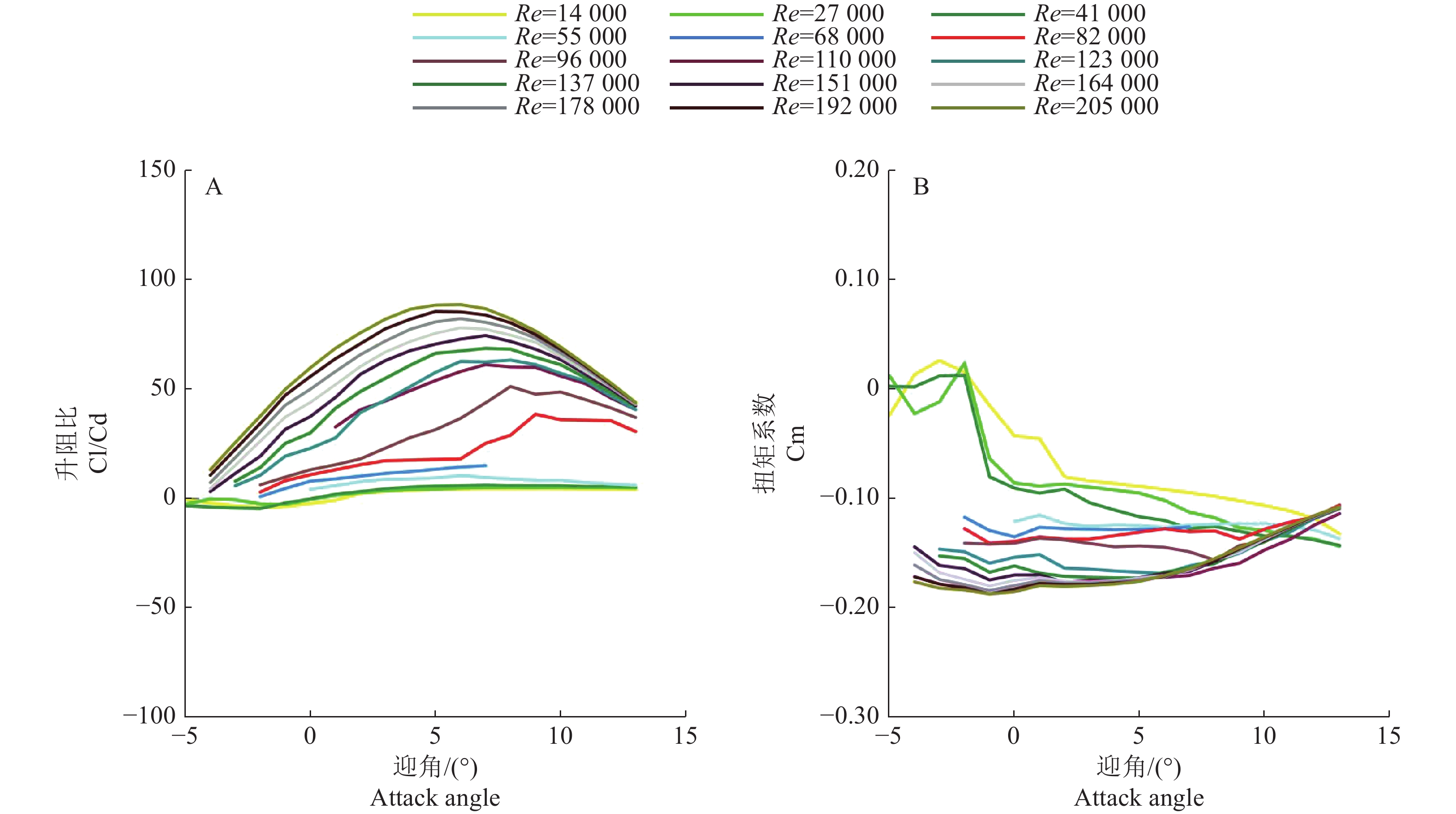图 5 不同雷诺数下的升阻比(Cl/Cd)和扭矩系数(Cm)与迎角关系 Fig. 5 Relationship between lift drag ratio (Cl/Cd), torque coefficient (Cm) and attack angle under different Reynolds number |