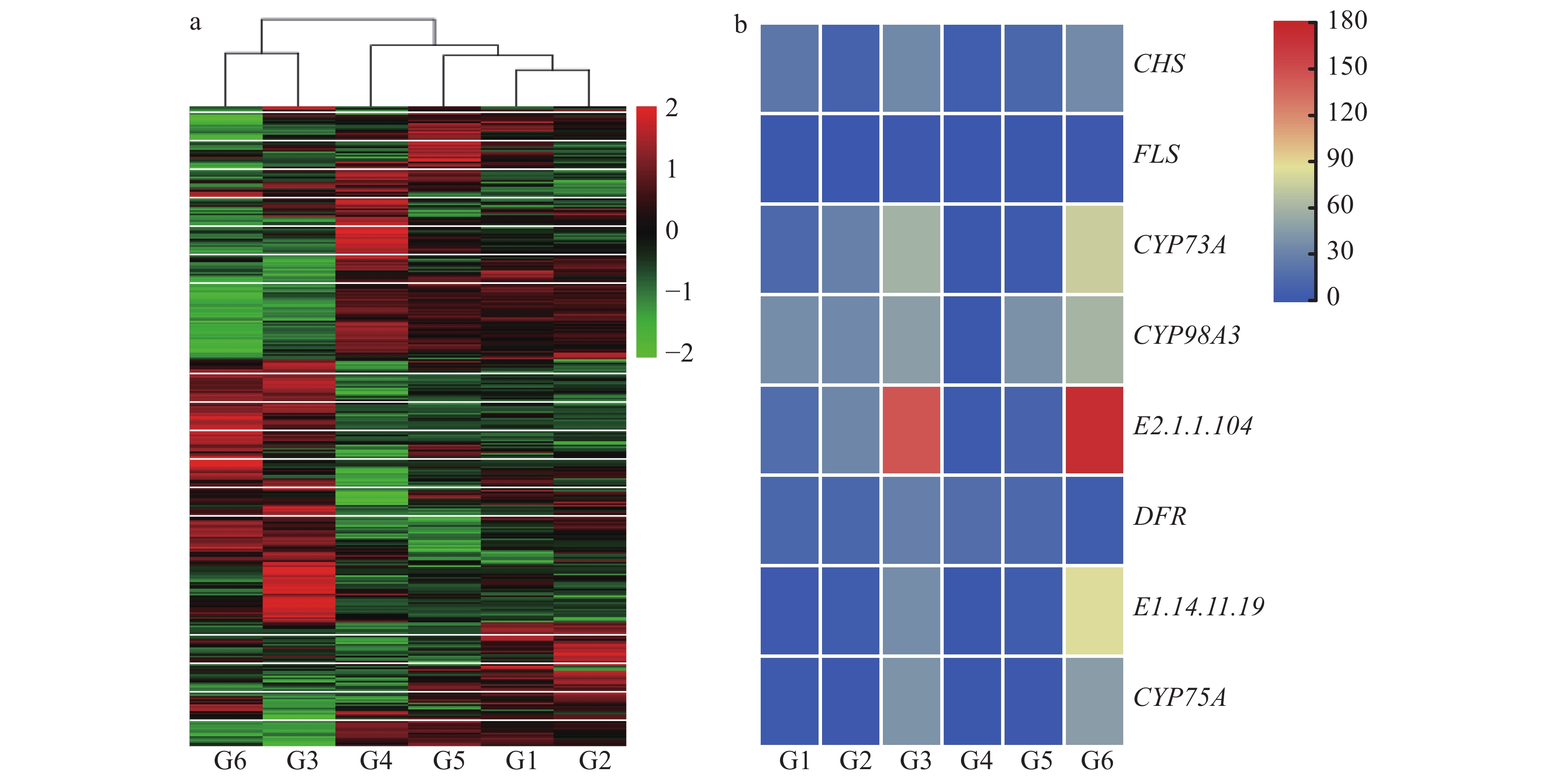 图 1 6个品种番石榴果实差异基因(DEG)的表达情况 Fig. 1 The expressions of differential genes (DEGs) in fruits of six guava cultivars a:差异基因表达量热图;b:类黄酮合成信号通路中的DEG;G1:红宝石,G2:西瓜红,G3:胭脂红,G4:珍珠,G5:水晶,G6:金斗香 a:Heat map of differential gene expression; b: The DEGs in flavonoid synthesis signaling pathway; G1: Hongbaoshi, G2: Xiguahong, G3: Yanzhihong, G4: Zhenzhu, G5: Shuijing, G6: Jindouxiang |