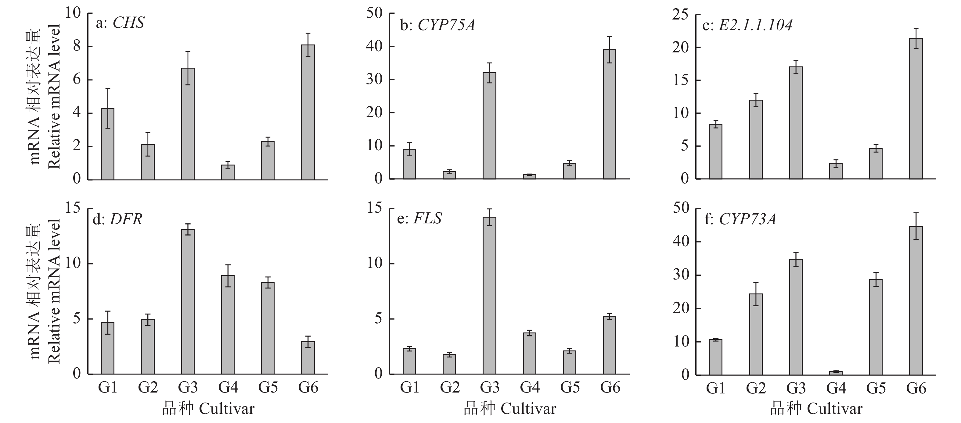 图 2 差异表达基因的qRT-PCR分析 Fig. 2 The qRT-PCR analysis of differentially expressed genes G1:红宝石;G2:西瓜红;G3:胭脂红;G4:珍珠;G5:水晶;G6:金斗香 G1: Hongbaoshi; G2: Xiguahong; G3: Yanzhihong; G4: Zhenzhu; G5: Shuijing; G6: Jindouxiang |
