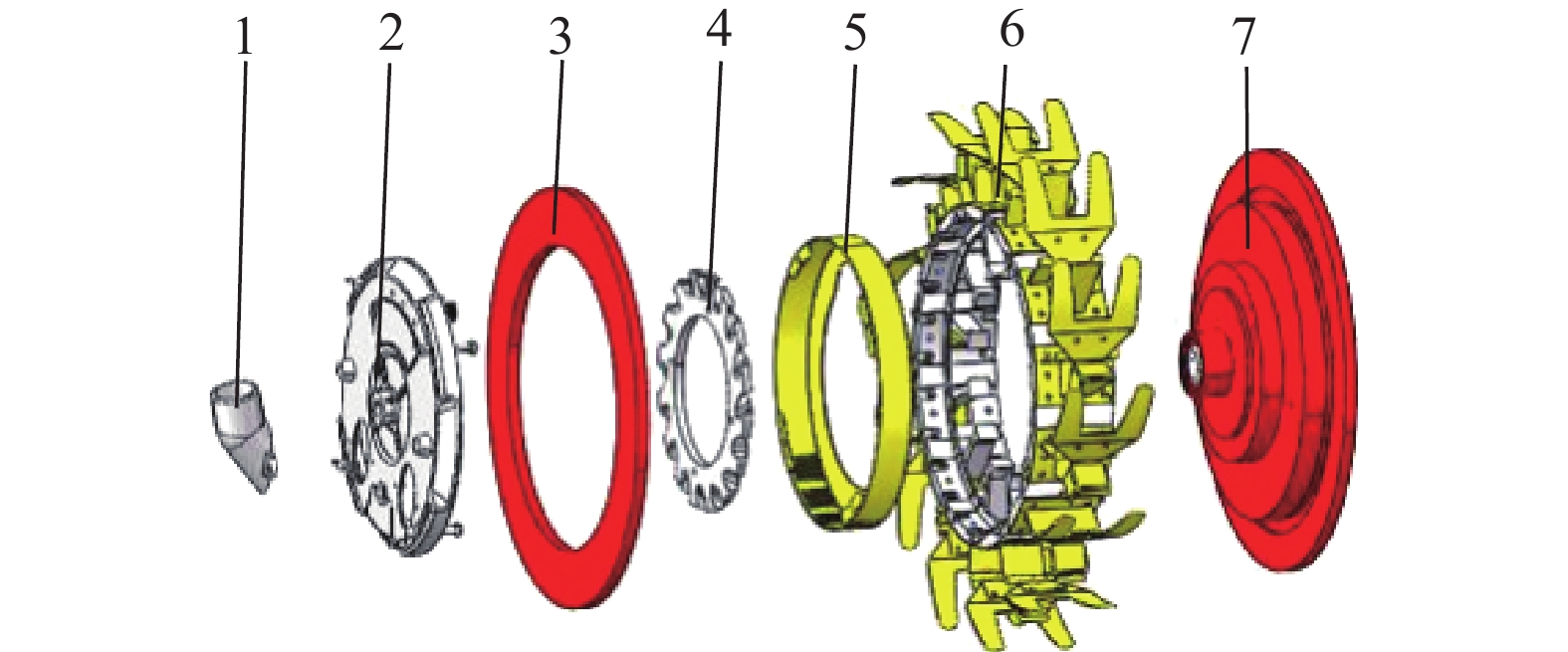 图 1 齿盘式穴播器结构 Fig. 1 Sprocket hole sower structure 1:进种管;2:外定盘;3:压盘;4:取种盘;5:存种圈;6:鸭嘴及腰带总成;7:动盘 1: Seed inlet tube; 2: Outer fixing plate; 3: Pressing plate; 4: Seed extraction plate; 5: Seed storage ring; 6: Duck beak and belt assembly; 7: Moving plate |