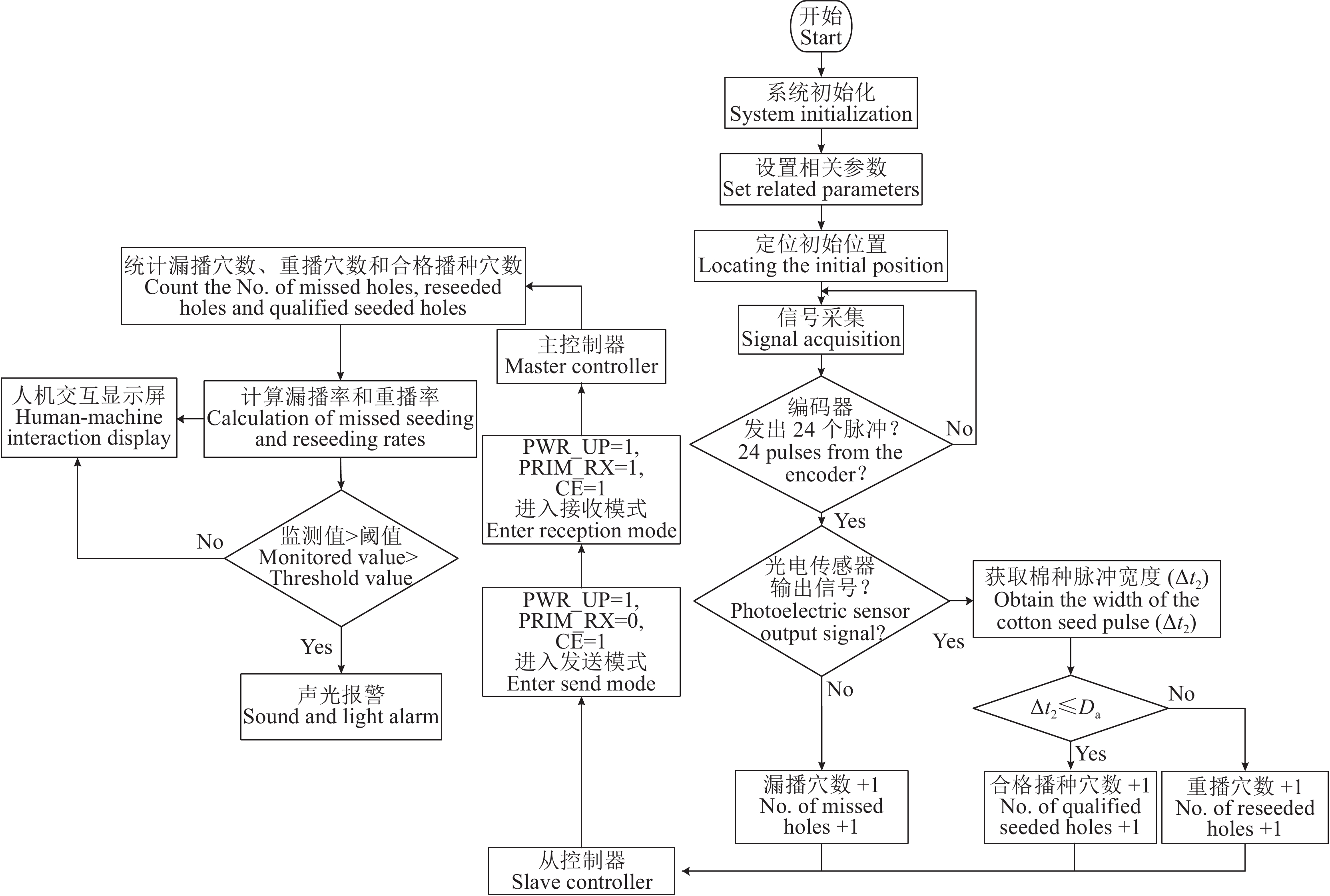 编码器定位初始位置后,取第1粒棉种所在的型孔标记1号型孔。棉种经过光电传感器时产生低电平脉冲信号,测得低电平脉冲时长,同时编码器发出脉冲信号,从控制器接收到编码器发出的24个脉冲信号后,立刻检测是否对应的有低电平脉冲信号。若没有检测到低电平脉冲信号,则判断漏播数加1,通过nRF24L01模块上传主控制器;若检测到低电平脉冲信号,则开始对低电平脉冲宽度进行判断,当Δt2≥Da,则重播数加1,通过nRF24L01模块上传主控制器,否则正常播种数加1,通过nRF24L01模块上传到主控制器。主控制器对合格播种量、漏播量和重播量进行统计。依据《单位(精密)播种机试验方法》(GB/T 6973—2005)[19],计算漏播率和重播率,将得到的数据信息显示在人机交互显示屏。当漏播率和重播率高于阈值时则发出声光报警。监测系统程序流程如图10所示。