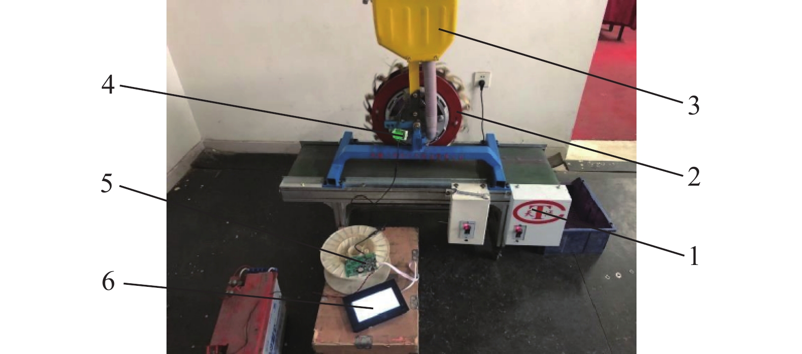 图 11 穴播器播量监测试验装置 Fig. 11 Seeding quantity monitoring test device for hole sower 1:播种试验台;2:齿盘式穴播器;3:种箱;4:信号处理模块;5:STM32控制器;6:人机交互显示屏 1: Sowing test stand; 2: Tine disc hole sower; 3: Seed box; 4: Signal processing module; 5: STM32 controller; 6: Human-machine interaction display |