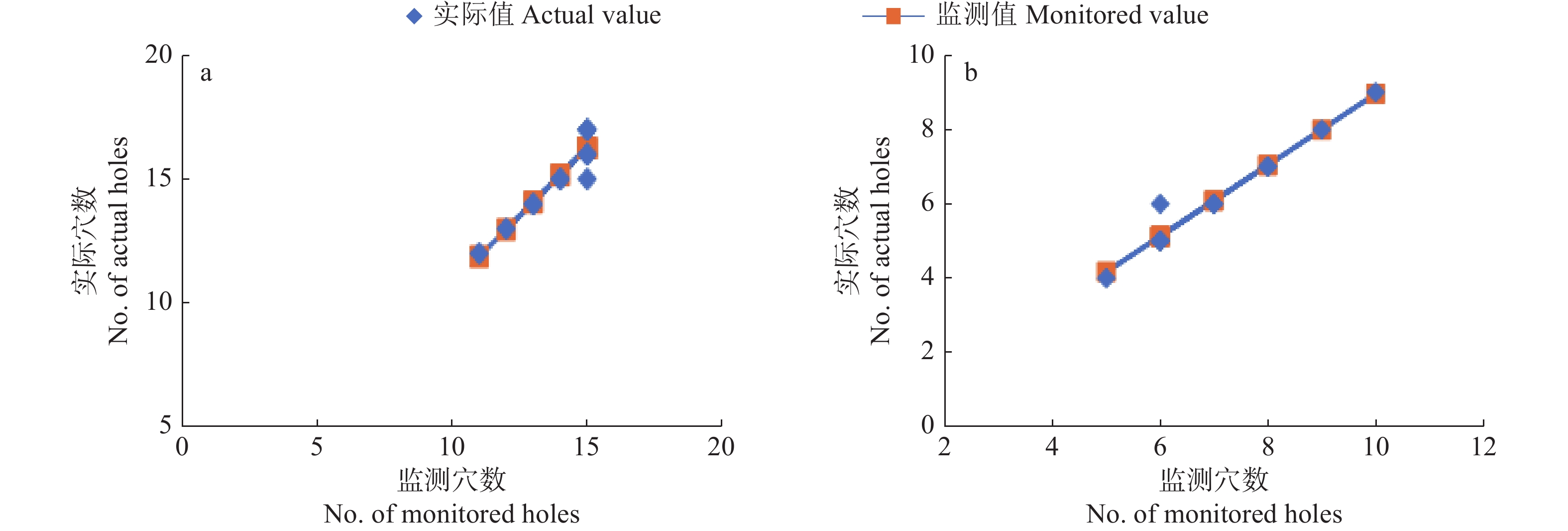 图 12 漏播(a)和重播(b)的实际穴数与监测穴数线性拟合曲线 Fig. 12 Linear fitting curve of actual and monitored hole number of missed seeding (a) and reseeding (b) |