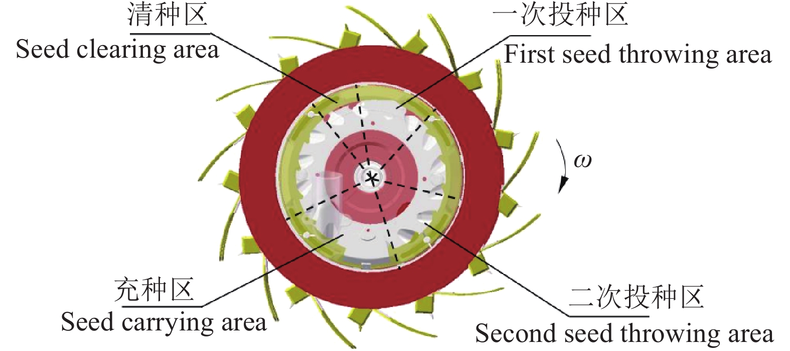 工作原理如图2所示,棉花齿盘式穴播器的工作过程包括:充种、清种、第1次投种和第2次投种。作业时,种箱内的棉种通过定盘上的进种管堆积在穴播器的存种圈内,取种盘跟随主轴顺时针转动,棉种在重力、种子间的相互作用力以及取种盘的扰动等因素的影响下进入取种盘型孔内,完成充种过程;取种盘继续旋转,达到一定高度时,取种盘型孔外部多余的种子在清种刷及重力作用下落至存种圈,完成清种过程;当取种盘转到存种圈下种口时,型孔内的种子因失去了存种圈的支持,从下种口处迅速掉落至分种腔等待,完成第1次投种过程;随着穴播器的滚动,鸭嘴在苗床上掘穴并打开,棉种流过鸭嘴完成第2次投种过程。第1、第2次投种过程示意图如图3所示。