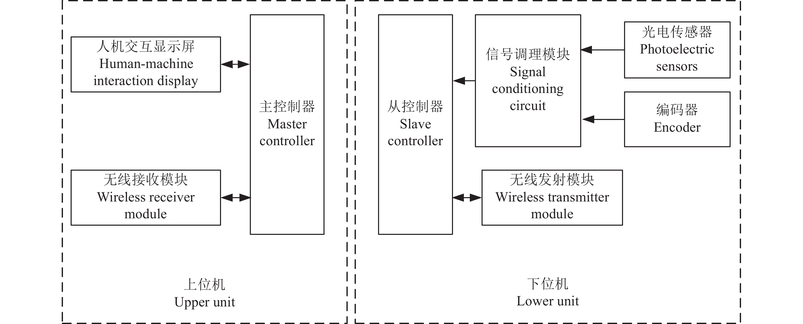 监测系统的结构组成如图4所示,下位机主要由光电传感器、编码器、信号调理模块、从控制器和无线发射模块组成。上位机主要由主控制器、无线接收模块和人机交互显示屏组成。每个穴播器单体包括光电传感器、编码器、信号调理电路、从控制器、无线发射模块。