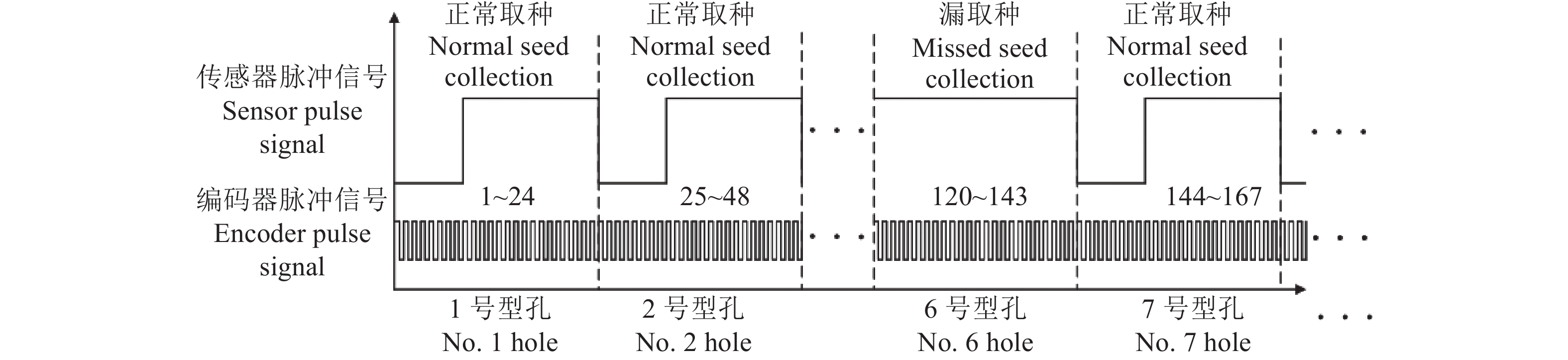 编码器随穴播器转动1周发出360个脉冲信号,取种盘转动1°编码器则输出1个脉冲信号。齿盘式穴播器为15穴,即每转动24°编码器即发出24个脉冲信号,24个脉冲信号中对应有1个传感器输出脉冲信号的变化。从控制器将光电传感器与编码器的脉冲信号做同步处理,监测编码器发出的24个脉冲信号时间内是否有传感器输出的1个脉冲信号变化,即可判定是否出现漏播。漏播脉冲信号示意图如图5所示,在6号型孔处,编码器发出的24个脉冲信号时间内所对应的光电传感器发出的为高电平脉冲信号,且无电平信号变化,故该型孔漏取种,判定为漏播。