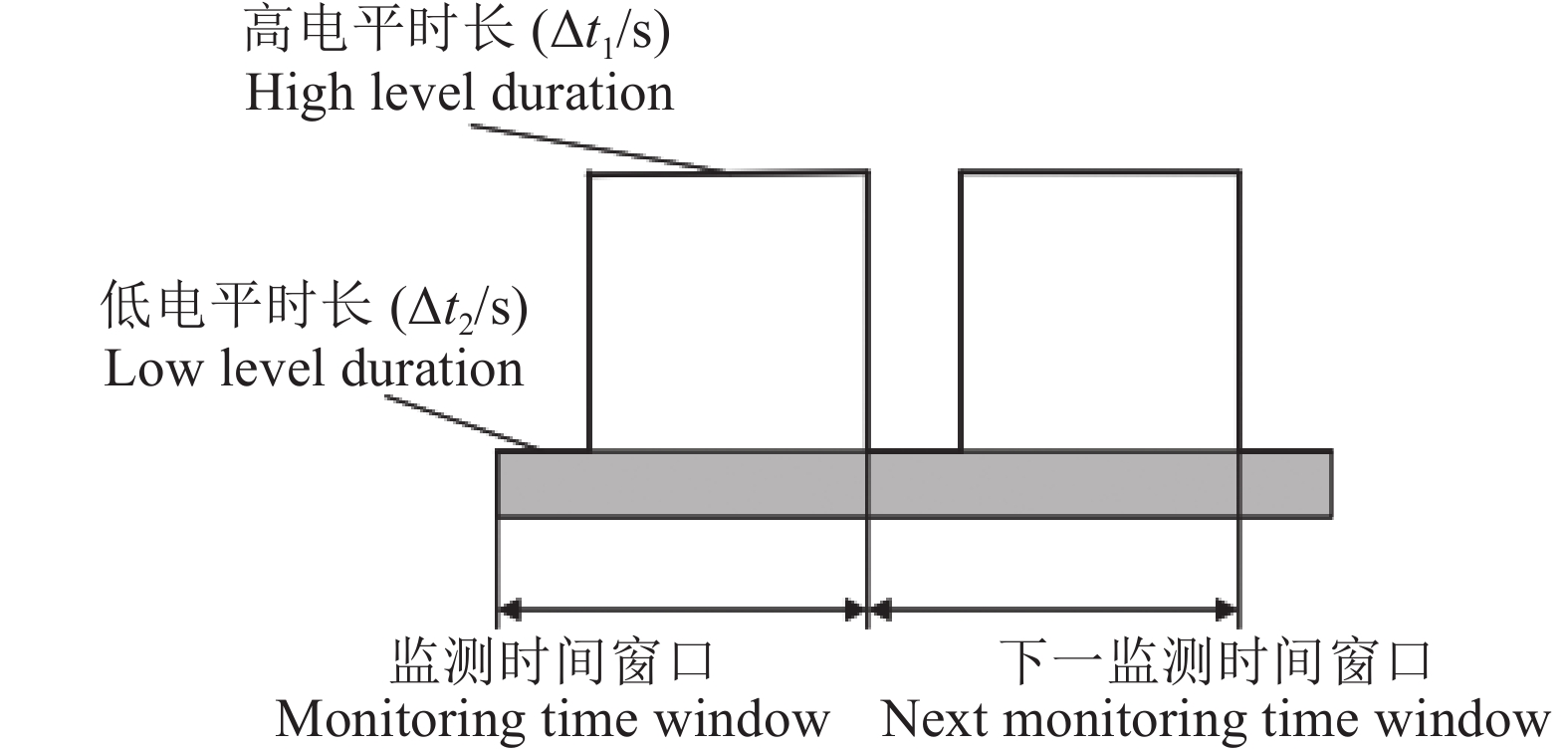 取种盘型孔内的棉种经过光电传感器的光敏感区产生低电平脉冲信号,微控制器捕获输入中断信号后开启定时器,从控制器内部对相应的脉冲宽度进行计算,分别测得高、低电平的时长Δt1、Δt2。将监测时间窗口内低电平时长Δt2(脉冲宽度)与预设棉种脉冲宽度(Da:单粒棉种经过传感器时长)对比,判断型孔内棉种数量。若Δt2>Da,则型孔内超过1粒棉种,即判定重播情况发生;若0<Δt2≤Da,则型孔内仅有1粒棉种,无重播情况发生,即为合格播种。重播脉冲信号示意图如图6所示。