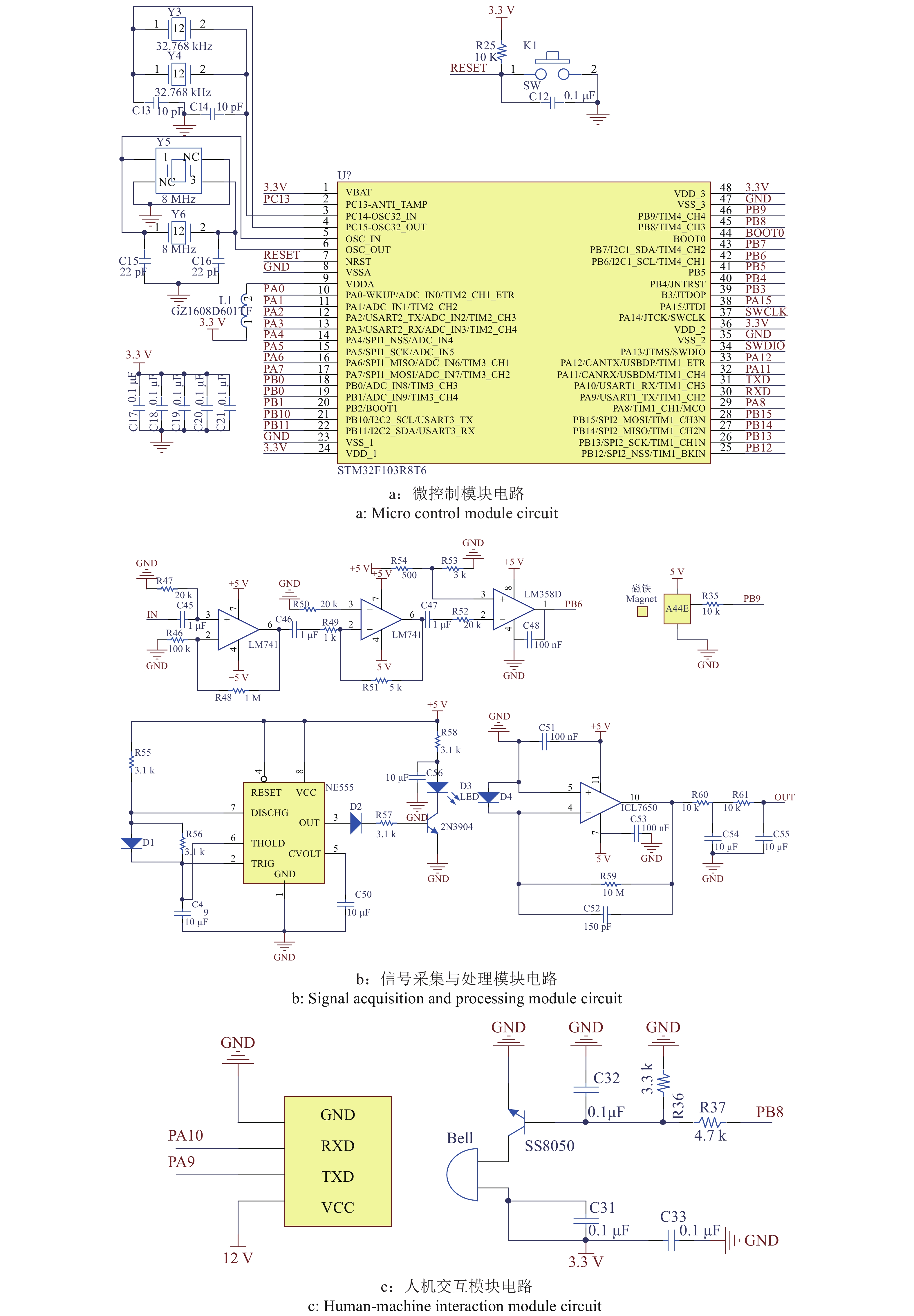 监测系统硬件由STM32F103C8T6微控制模块、信号采集与处理模块、人机交互模块等组成。采用模块化方式对各模块电路进行设计,以提高监测系统整体电路质量。监测系统总电路如图7所示。