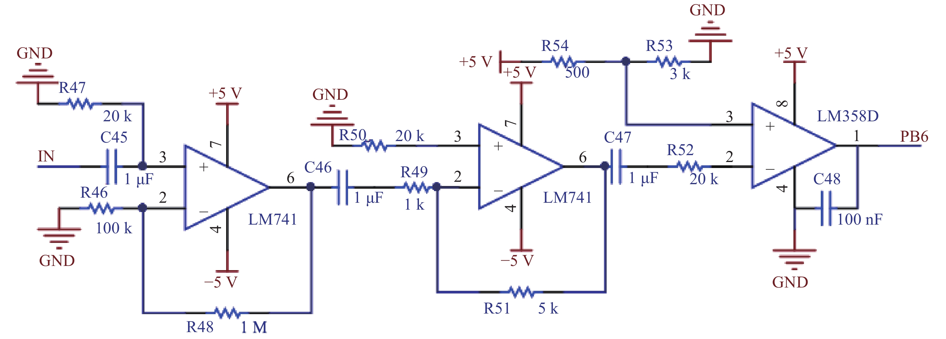 本文设计的监测系统中信号调理电路包括双级放大电路和比较电路。信号放大电路由LM741运算放大器构成,该运算放大器具有高速、低噪声和超低失真的特性,可在3.3~12.0 V的电源电压范围内工作。信号放大电路将传感器产生的微小信号进行放大至饱和状态,以便获得稳定的脉冲信号;比较电路由LM358D比较器构成,将信号放大电路输出的脉冲信号整形为方波信号。其电路原理如图9所示。