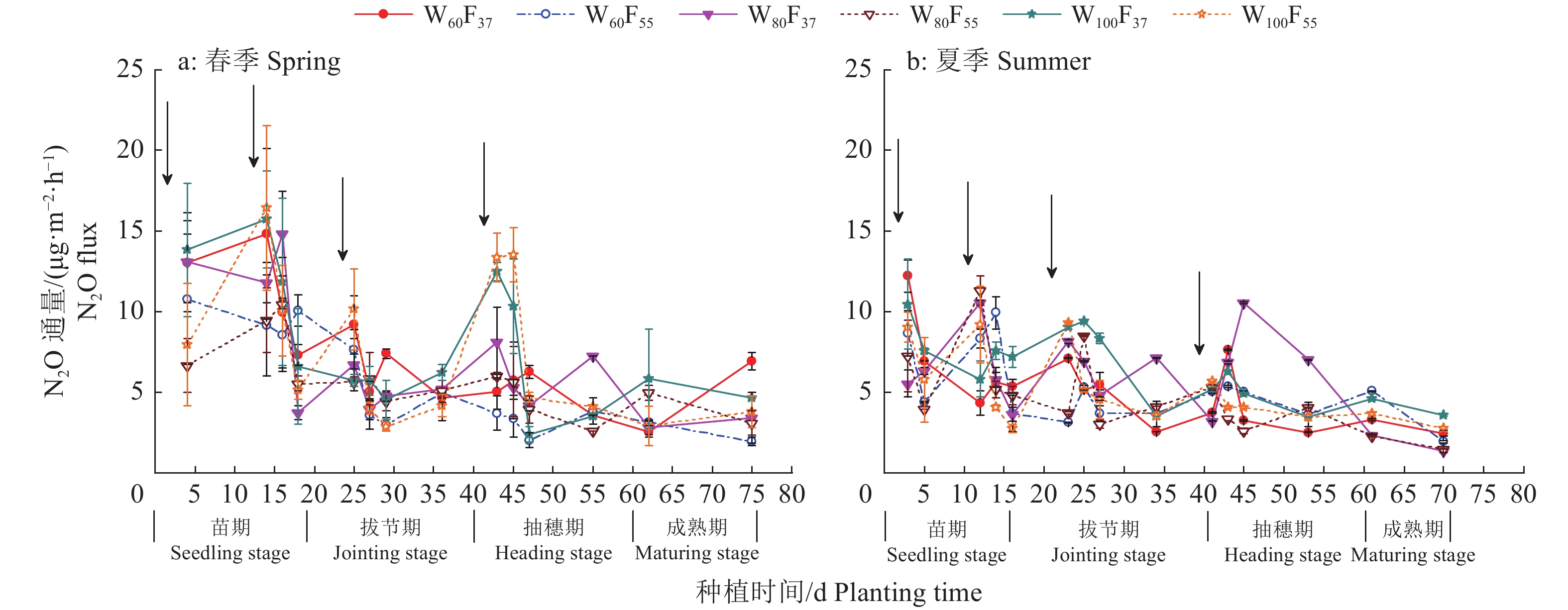 夏季玉米试验中(图1b),在3个水平的灌水量处理下,施肥后N2O通量除苗期表现为施氮比例F37 < F 55以外,其他时期均表现为F37 > F 55。F37处理下,施肥后N2O通量在拔节期和成熟期为W60 < W 80 < W 100,苗期为W60 < W 100 < W 80,抽穗期为W100 < W 60 < W 80。F55处理下,施肥后拔节期和抽穗期的N2O通量为W60 < W 80 < W 100,苗期为W100 < W 60 < 80,成熟期为W80 < W 100 < W 60。总的来看,W100处理下施肥后N2O通量除抽穗期外均高于W60和W80,相同灌水量下,施肥后除苗期外,N2O通量表现为施氮比例F55 < F 37。
