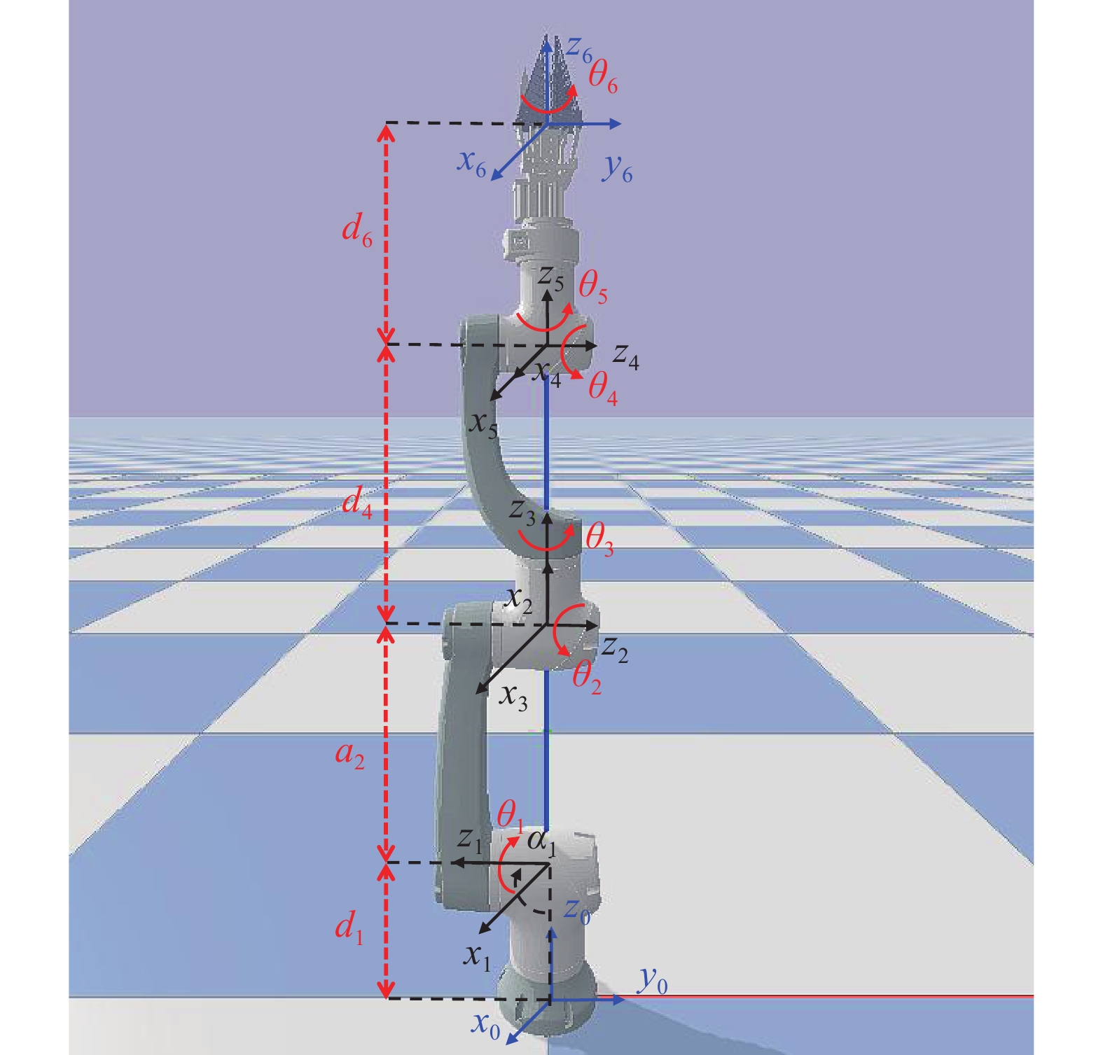 图 1 采摘机械臂 Fig. 1 Picking manipulator θ:关节角;d:关节偏移量;a:连杆长度;α:连杆扭转角;xyz:机器人坐标系,其中,蓝色坐标系为机械臂的原点和末端坐标系,黑色坐标系为关节坐标系 θ: Joint angle; d: Joint distance; a: Link length; α: Link twist angle; xyz: Robot coordinate system, in which the blue coordinate system is the origin and end coordinate system of the manipulator, and the black coordinate system is the joint coordinate system |