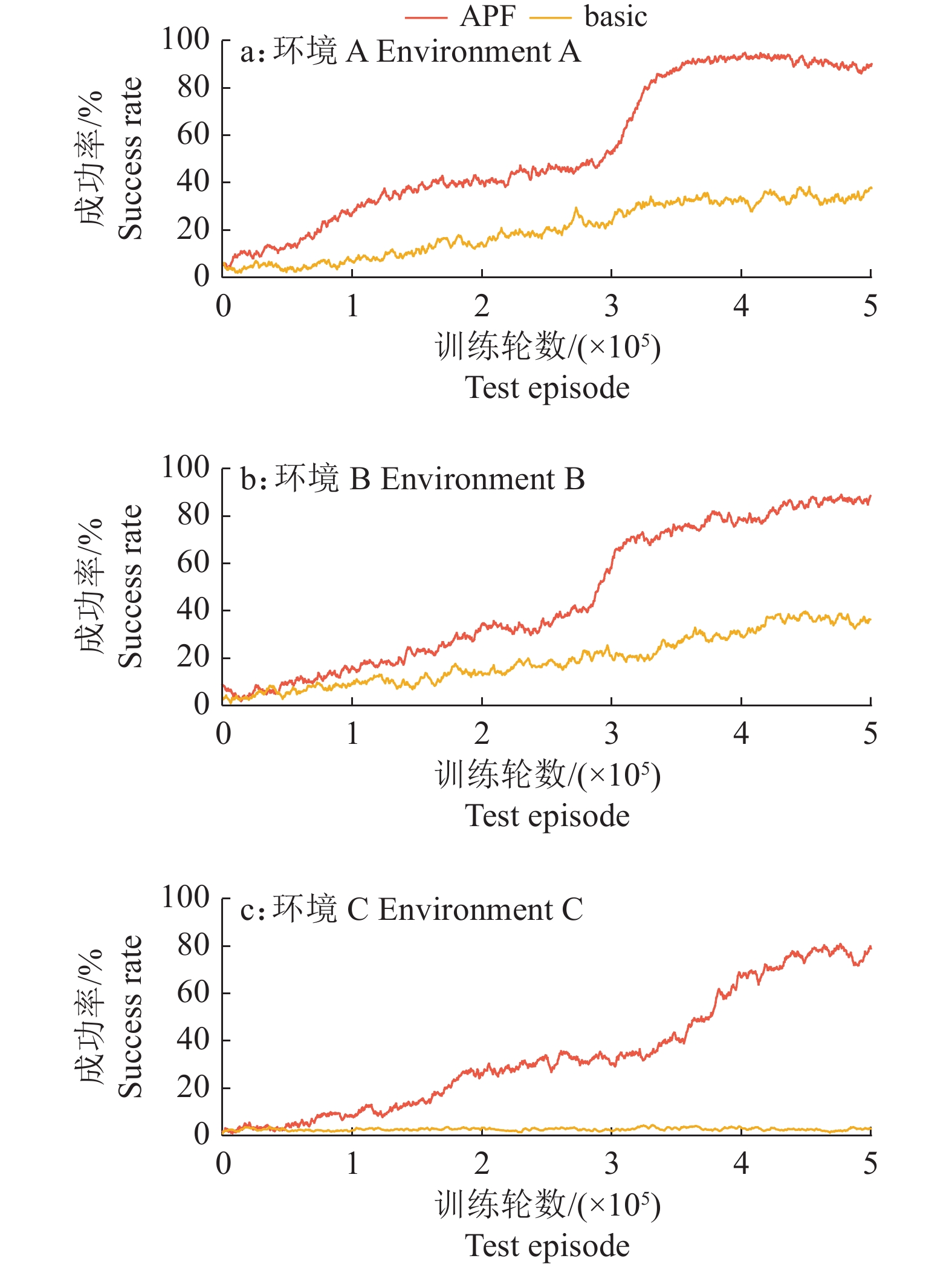 在环境A和B中,训练曲线的变化趋势大体相似。在训练初期,APF方法的上升幅度高于basic。之后在3×105集左右,APF方法训练的效果出现大幅提升,远超过basic方法。基于basic方法训练的算法在环境A和环境B中的成功率分别为38%和36%,而基于APF方法训练的算法的路径规划成功率更高,在环境A和环境B中分别达到90%和88%。在环境A中,APF方法的成功率出现了回落,随着训练次数的增加,降低的情况更加严重,不利于算法获得更好的性能。这是因为,在避障问题中进行更多的探索并不能解决动作价值高估的问题,使算法陷入了局部最优问题。在环境C中,basic方法无法完成任务,APF方法的收敛速度略慢于前2个环境,在4×105集左右才开始收敛,并且震荡幅度相较于前2个环境更大,最终成功率为79%。