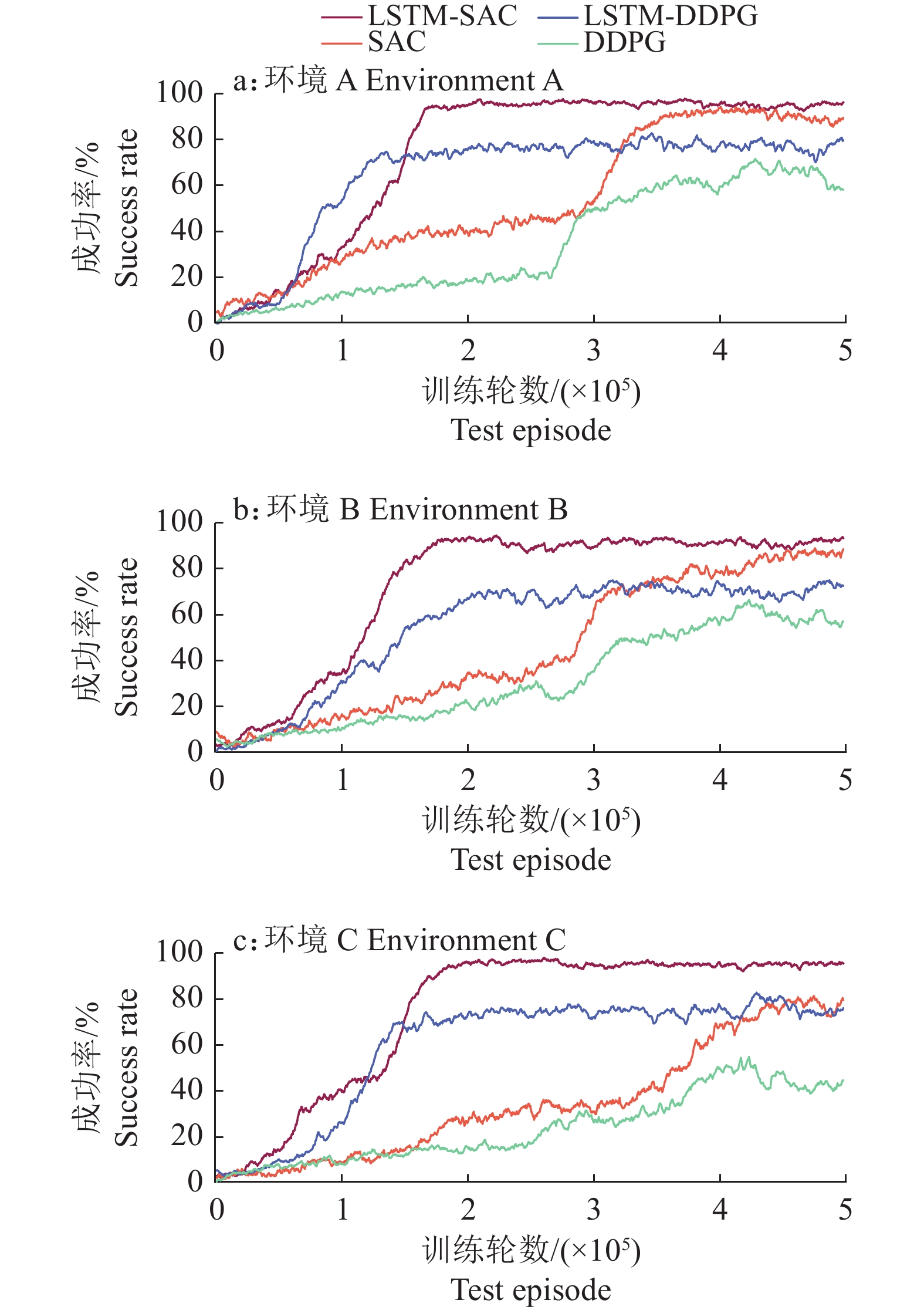 试验同样基于环境A、B和C,每个环境中执行5×105集迭代训练,在学习过程中定期评估100次测试的采摘路径规划成功率,并将它作为评价指标进行分析。沿用“2.1”中的深度强化学习算法训练参数,将包含LSTM结构的2种改进算法分别记作LSTM-DDPG和LSTM-SAC,试验所得不同算法在不同环境下的采摘路径规划成功率情况如图11所示。