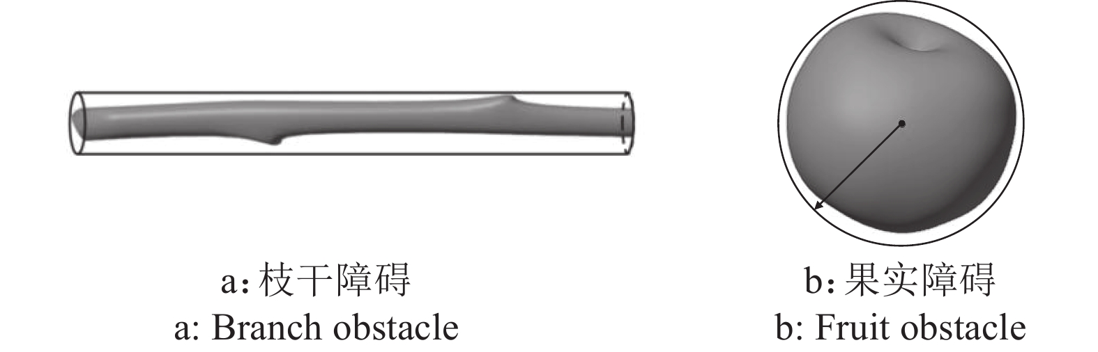 本文采用几何包络法实现障碍物的近似描述从而进行碰撞检测[5,24-25]。因树叶具有良好的柔性,对机械臂采摘作业的影响很小,可以不计算树叶的碰撞[26]。如图2所示,使用圆柱体包络表示枝干障碍,使用球体包络表示非目标果实障碍。对于目标果实,不采取碰撞检测,而使用采摘点作为近似替代。