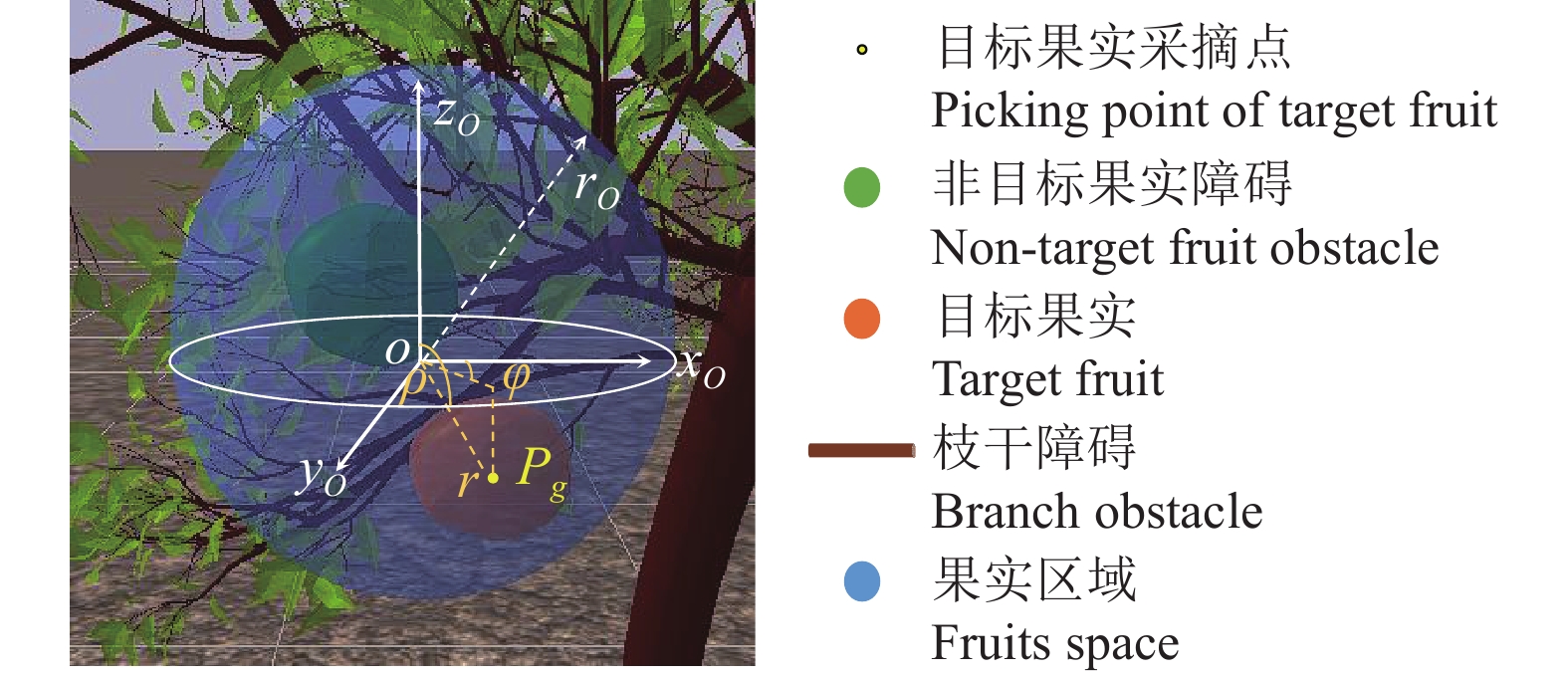 图 3 果实区域 Fig. 3 Fruits space Pg:采摘点,O:果实区域原点,rO:果实区域半径,r:径向距离,φ:方位角,ρ:极角 Pg: Picking point, O: Origin point of fruits space, rO: Radius of fruits space, r: Radial distance, φ: Azimuth angle, ρ: Polar angle |