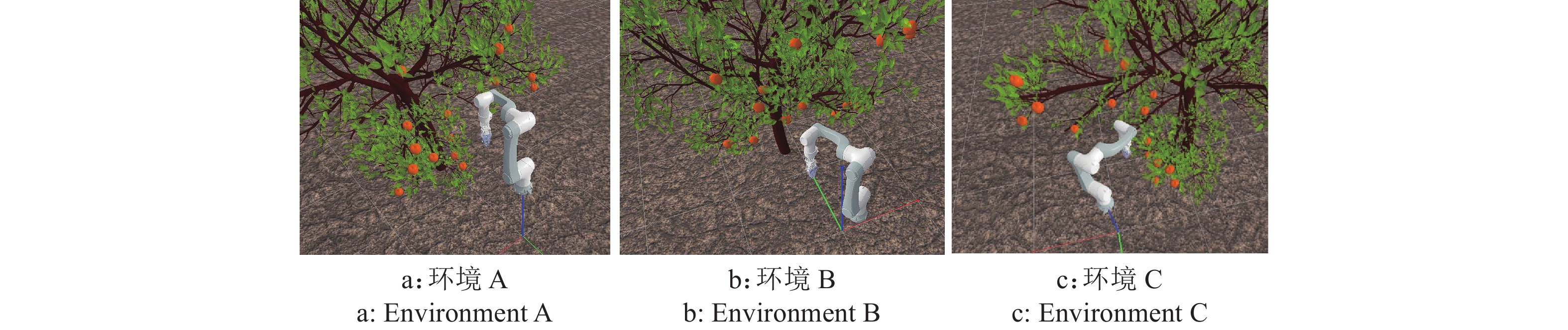 环境A中机械臂和果树的基座标分别为(0,0,0.75)和(0.25,−1.70,0);环境B中机械臂和果树的基座标分别为(0,−0.30,0.75)和(0,1.30,0);环境C中机械臂和果树的基座标分别为(0,0,0.75)和(−1.00,−1.20,0)。