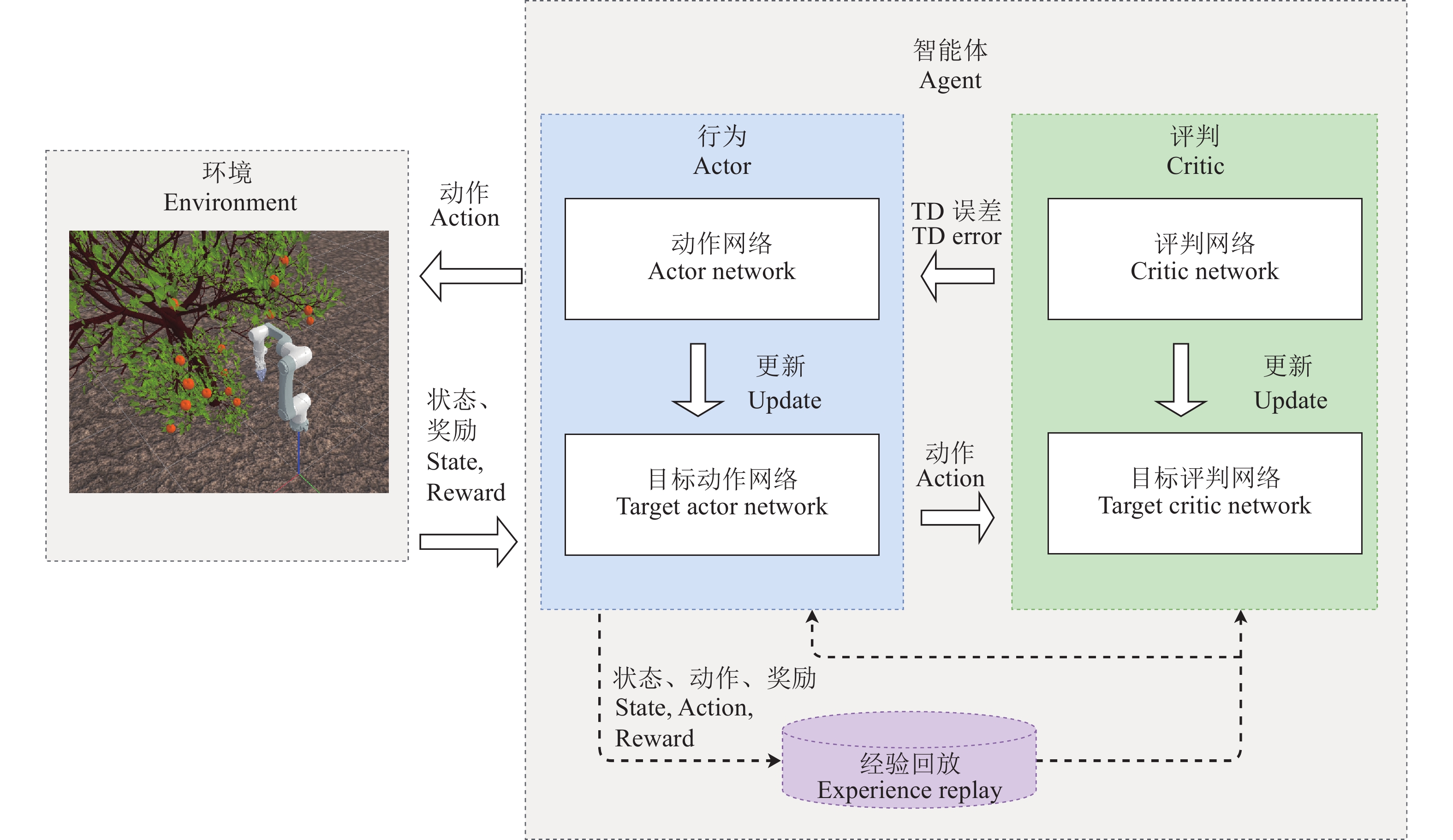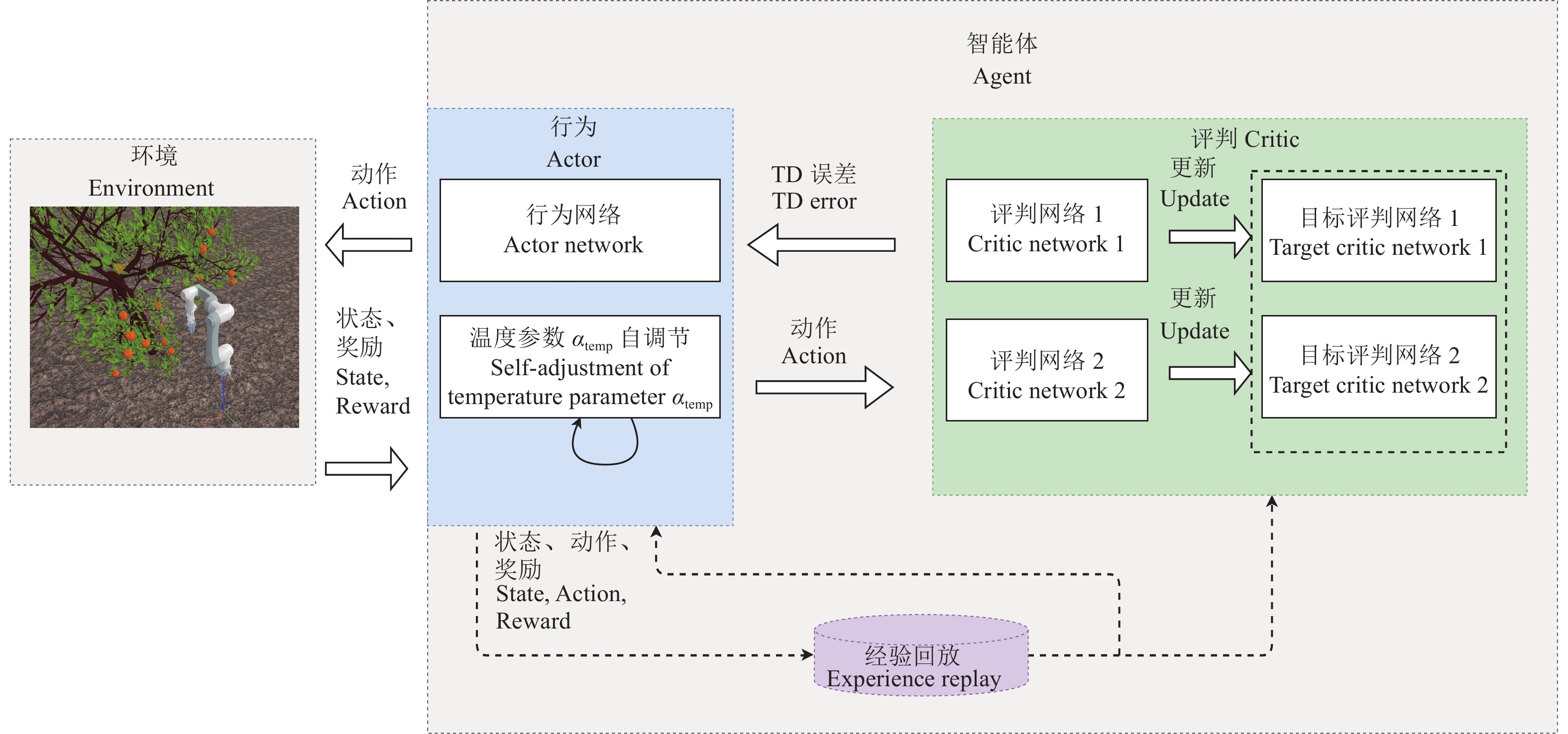 近年来,深度强化学习(Deep reinforcement learning, DRL)的快速发展给传统的人工势场法带来了更多的可能。深度强化学习通常基于几个神经网络作为预测操作的策略,通过与环境交互的方式获取数据,对获取的数据进行训练学习控制决策,在计算方面拥有更好的鲁棒性,从而管理一系列复杂的机械臂任务[16-18]。采摘机械臂执行采摘作业任务可以抽象化为一个马尔可夫决策过程。因此对于非结构化环境下采摘机械臂的路径规划问题可以通过深度强化学习进行求解。深度强化学习中的深度确定性策略梯度算法(Deep deterministic policy gradient,DDPG)算法和软行为评判(Soft actor critic,SAC)算法可以应用于机械臂连续动作控制的领域。但是,采摘机械臂工作的非结构化环境复杂导致了网络的训练效率低。Lu等[19]提出一种信息瓶颈理论,尽可能地限制从环境观测传递到状态标识的信息,鼓励神经网络去学习一些高维的特征,提升了算法的训练效果。DeepMind的研究者在文献[20]中提出一种结合了LSTM的改进架构(Contrastive bert for reinforcement learning,CoBERL)进行深度强化学习,以提高数据的处理效率。Lin等[21]提出了一种结合了循环神经网络的DDPG算法,应用在番石榴采摘机器人上,获得了较好的鲁棒性。