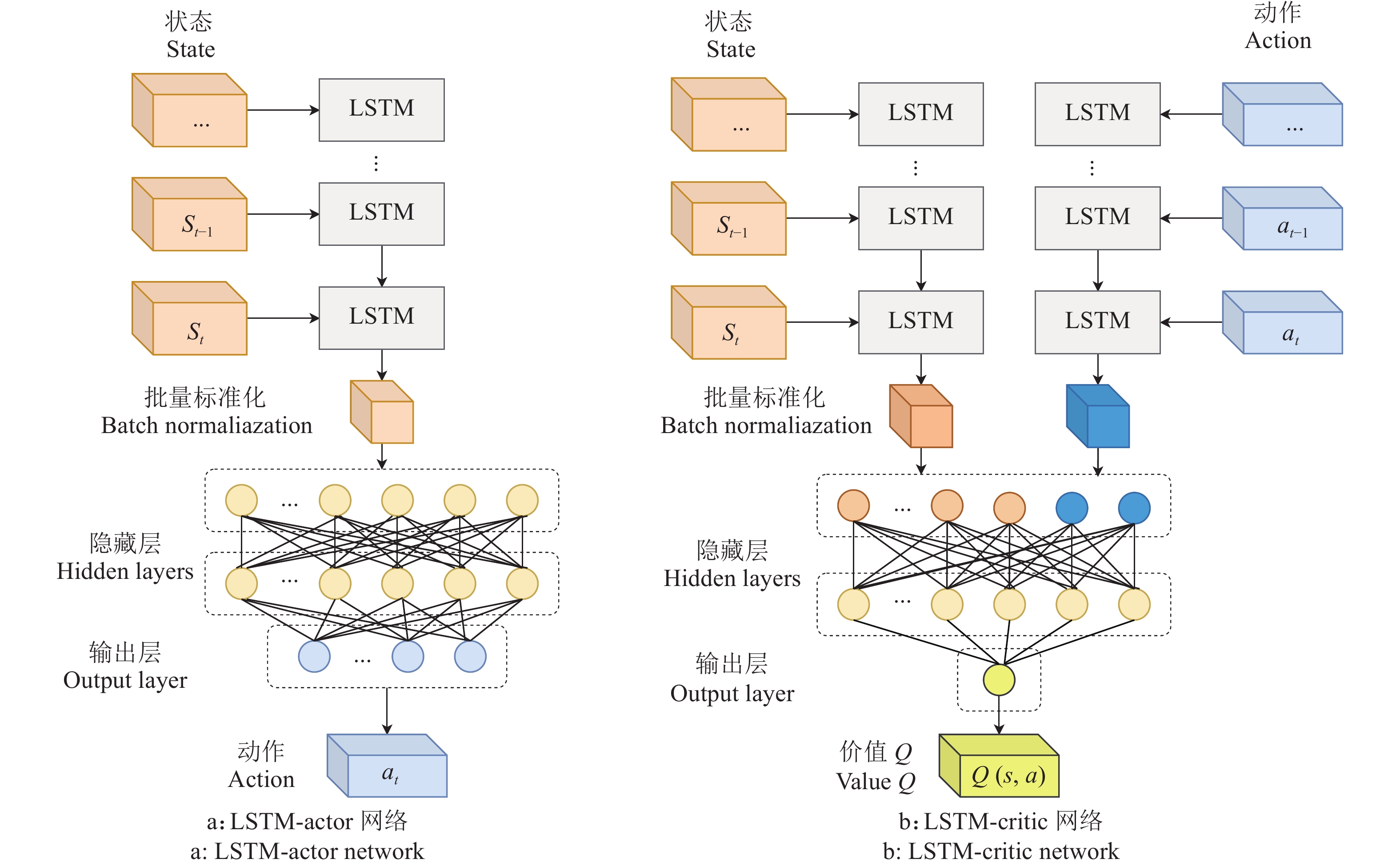 图 9 LSTM-actor网络与LSTM-critic网络结构 Fig. 9 LSTM-actor network and LSTM-critic network structure |